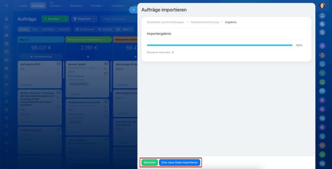 5. Warten Sie auf den Abschluss des Imports. Je mehr Aufträge importiert werden, desto länger kann der Prozess dauern. Nach Abschluss des Imports überprüfen Sie die Liste der Aufträge im CRM.
