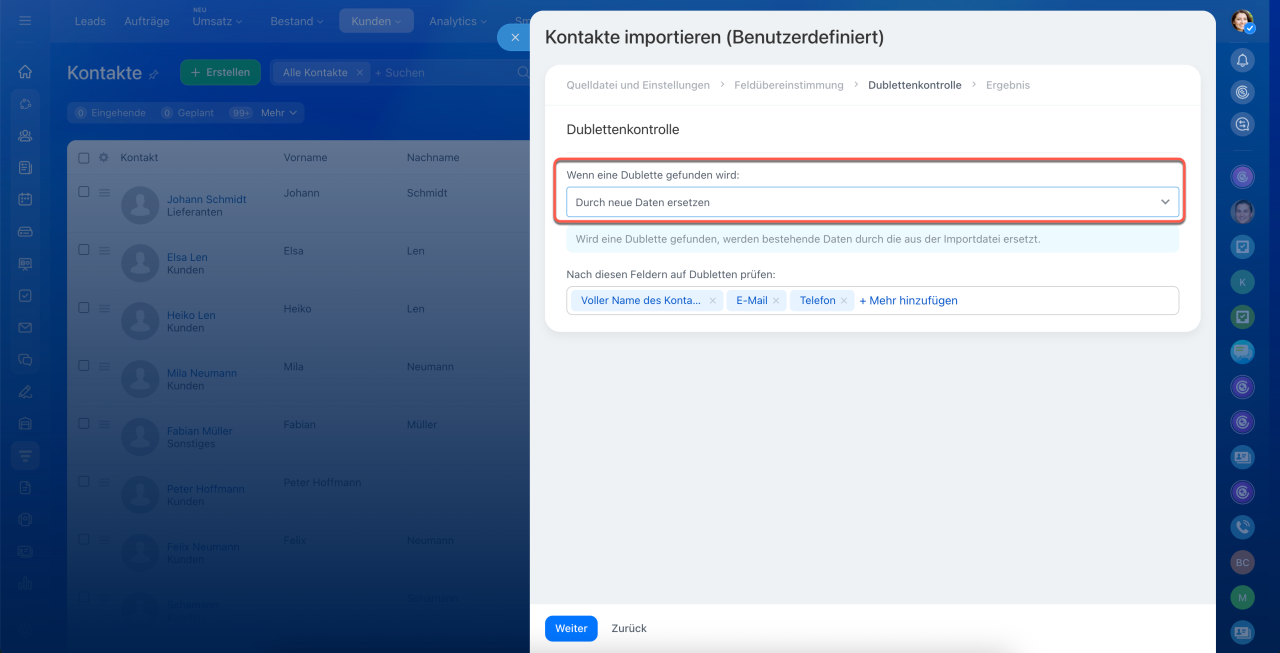 - Wählen Sie im Bereich Dublettekontrolle die Option Ersetzen. Kontakte mit detaillierten Informationen importieren