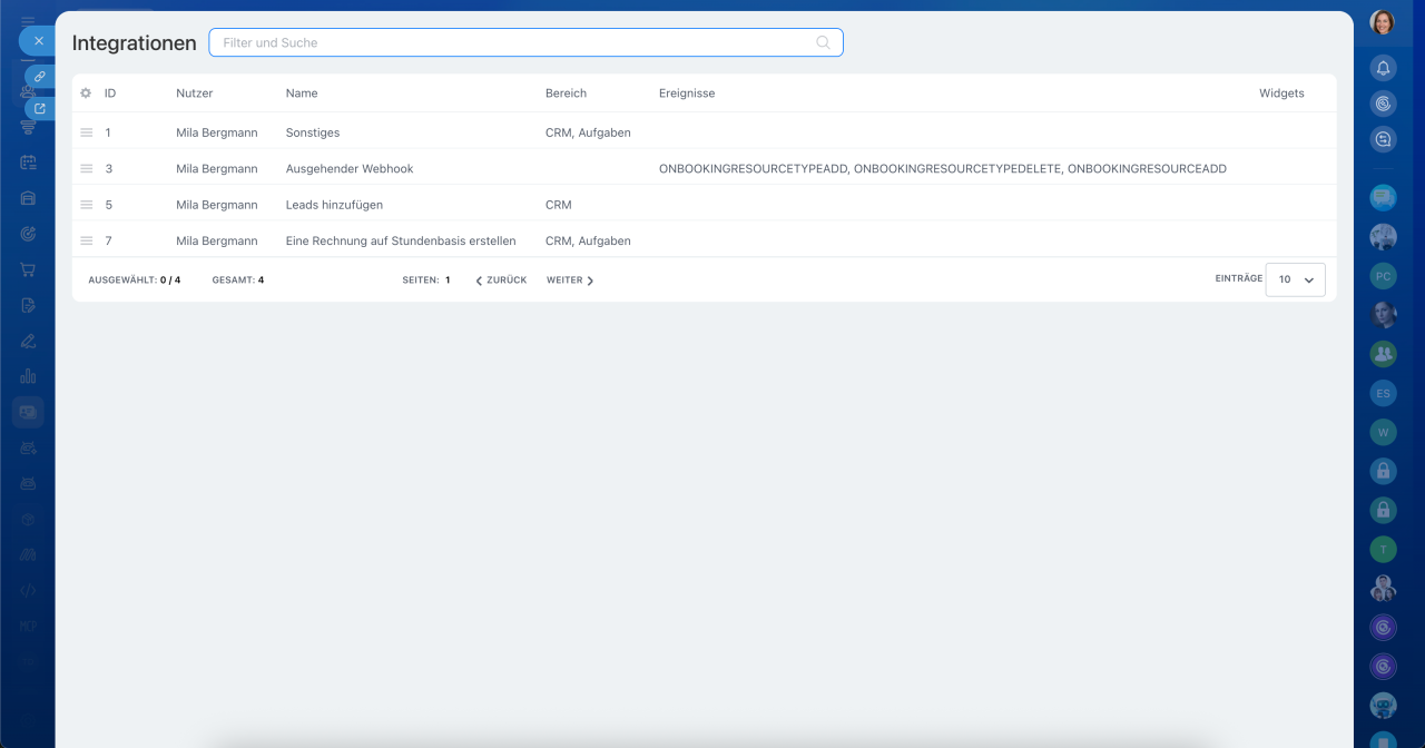 Um eine Liste aller Mitarbeiter mit aktiven Integrationen anzuzeigen: