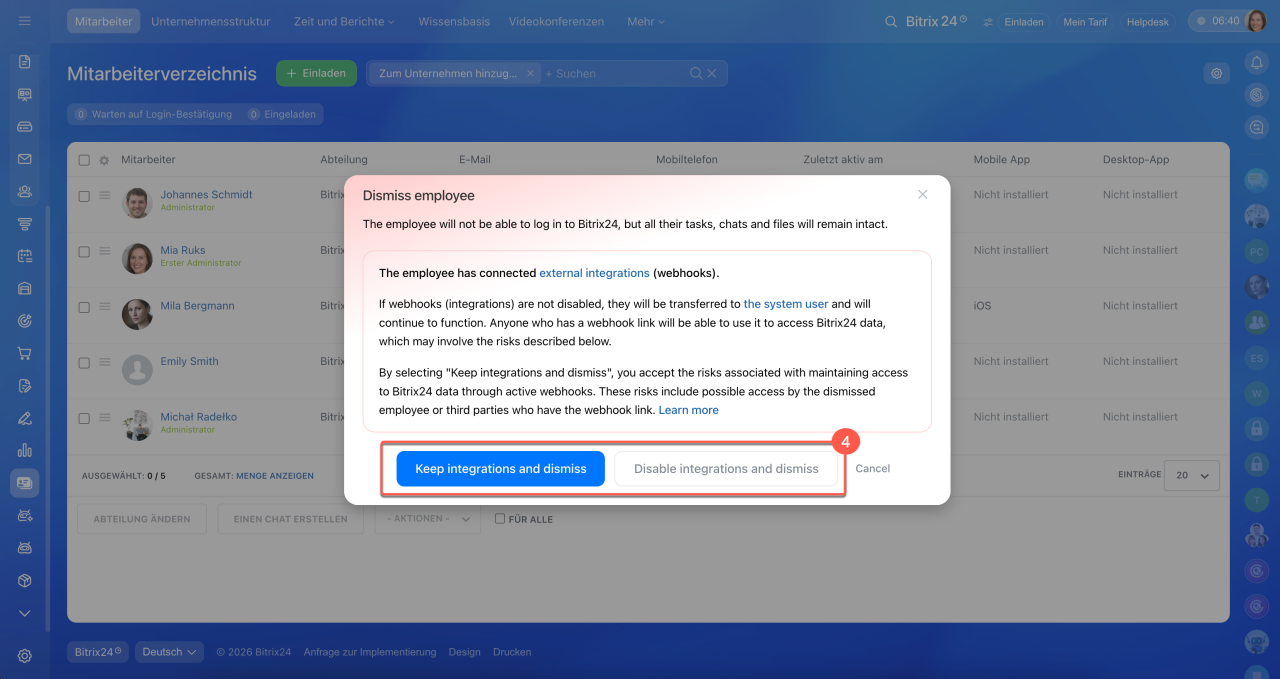 Die Deaktivierung eines Mitarbeiters mit aktiven Integrationen (Webhooks Webhook – ein Programmcode, mit dem Änderungen auf einer Website verfolgt und Daten an eine andere Anwendung übertragen werden können.) erfolgt auf dieselbe Weise wie bei einem regulären Mitarbeiter – entweder über die Mitarbeiterliste oder über das persönliche Profil. In beiden Fällen wird ein Dialogfenster angezeigt, in dem Sie auswählen können, ob die Integrationen deaktiviert oder weiterhin aktiv bleiben sollen.