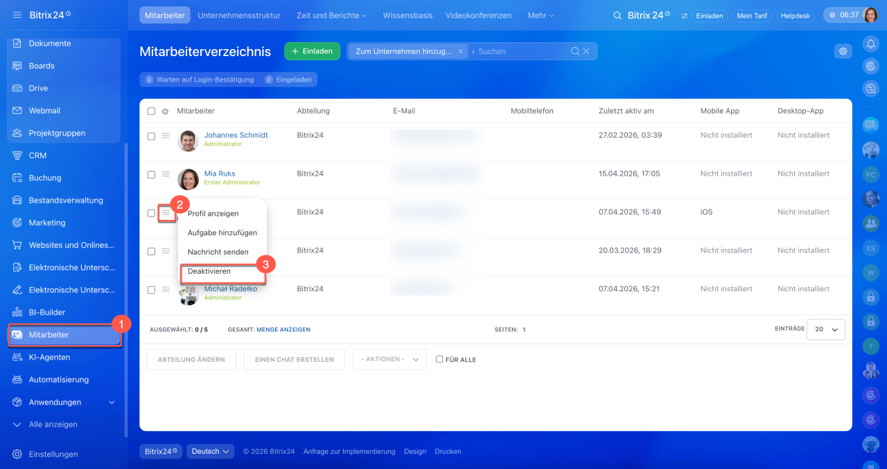 2–3. Klicken Sie neben dem Mitarbeiternamen auf ≡ > Deaktivieren.