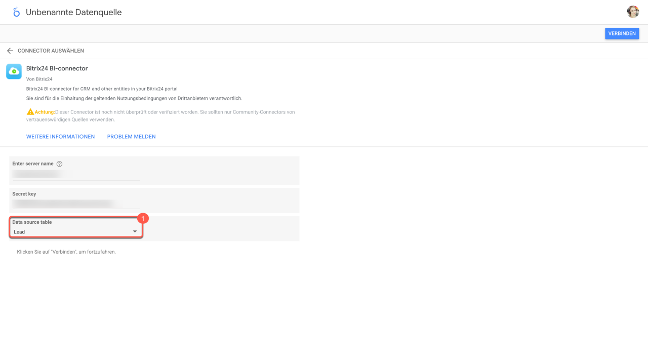 • Beim Herstellen der Verbindung mit Google Looker Studio klicken Sie auf das Feld Data source table, wählen Sie die gewünschte Quelle aus, benennen Sie die Quelle und klicken Sie auf Verbinden.
