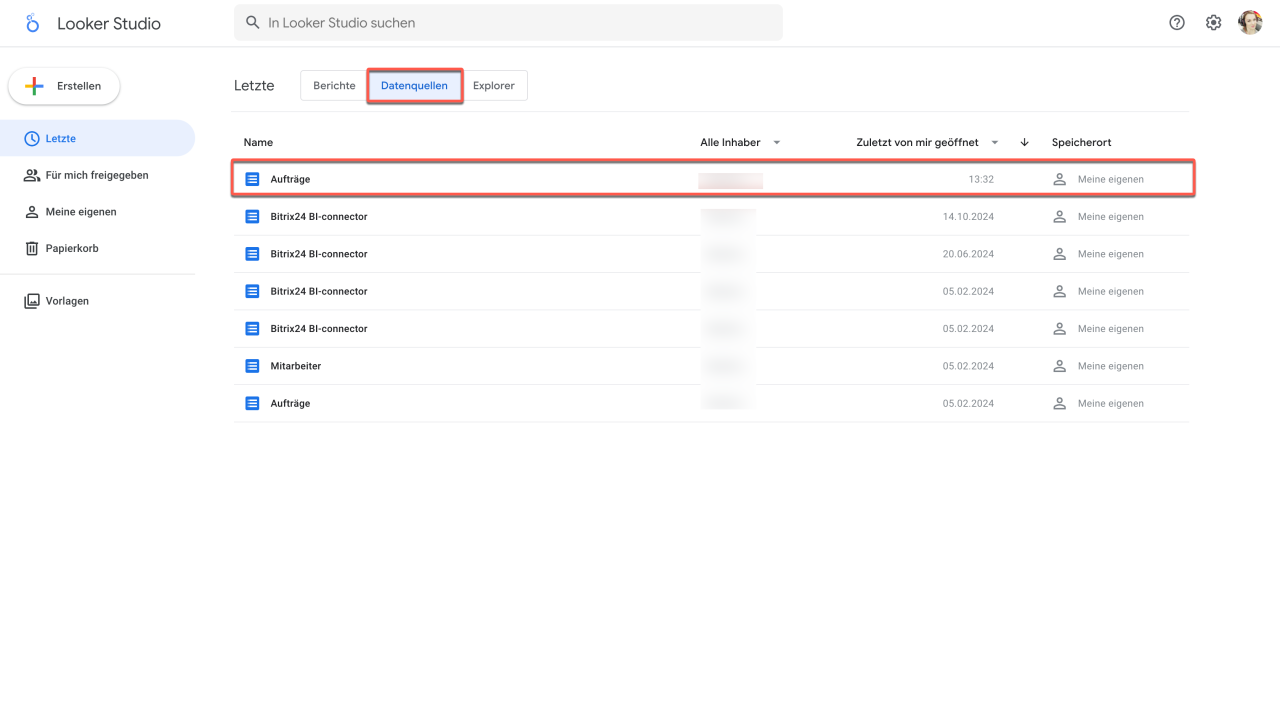 Die neue Datenquelle erscheint im Bereich Datenquellen in Google Looker Studio.
