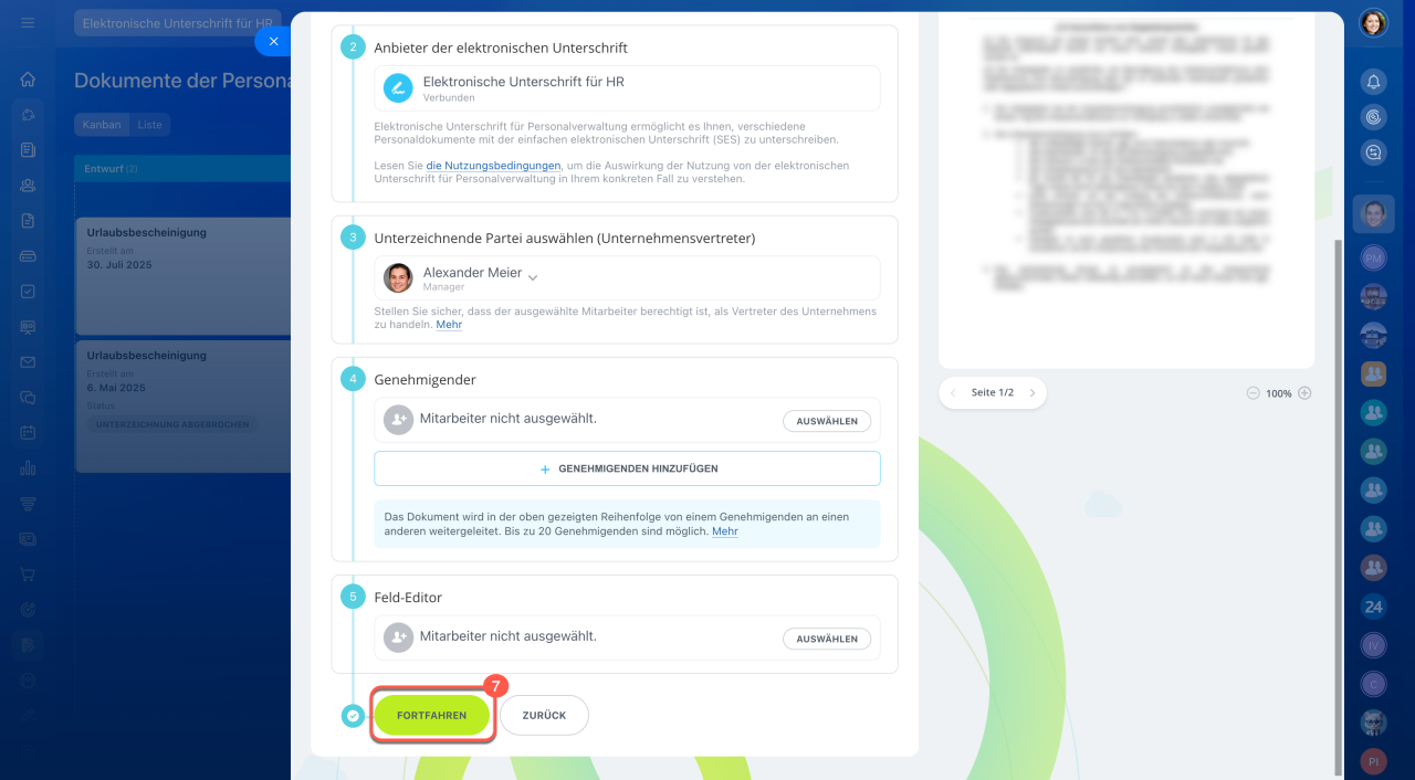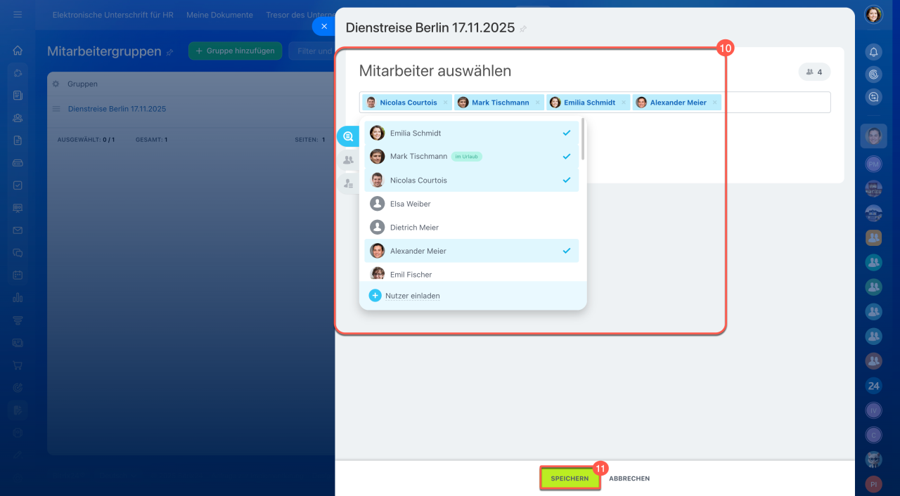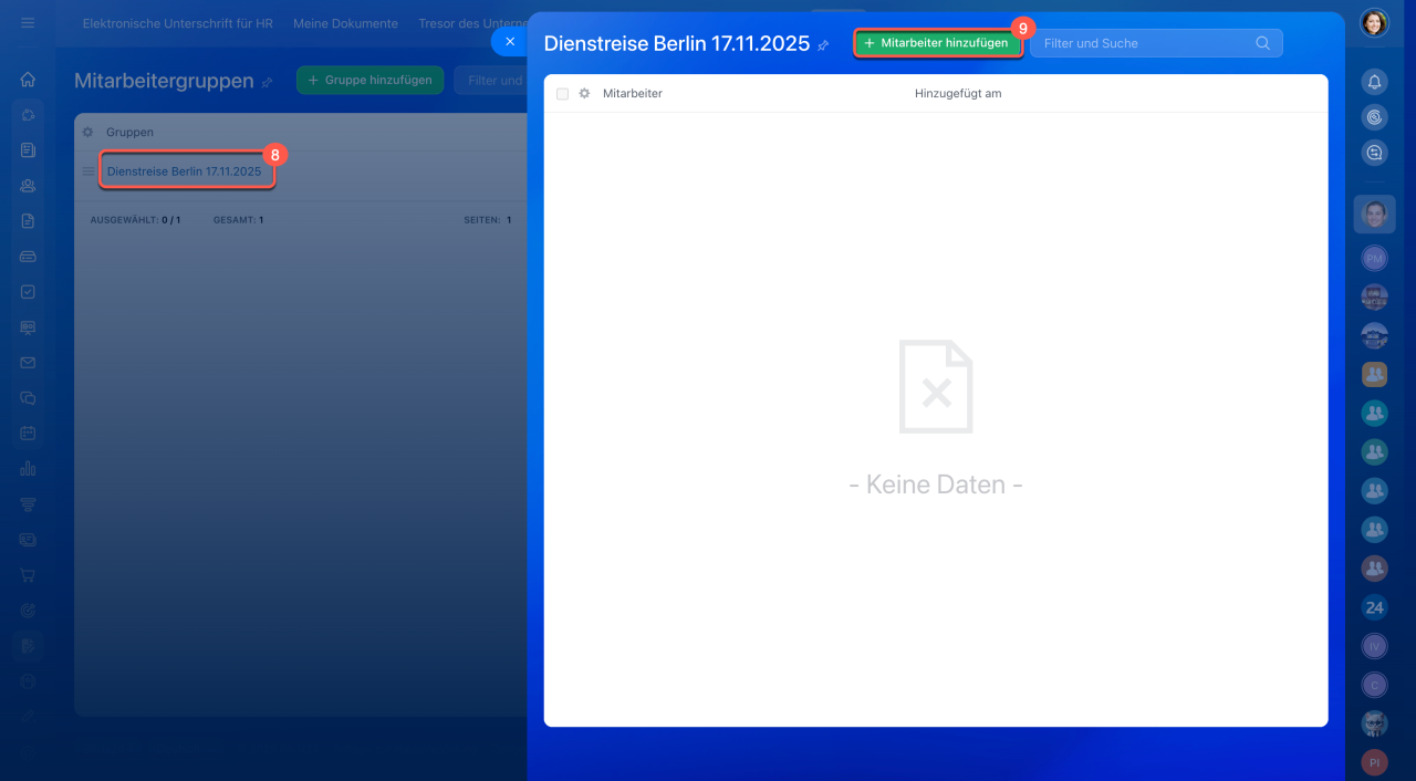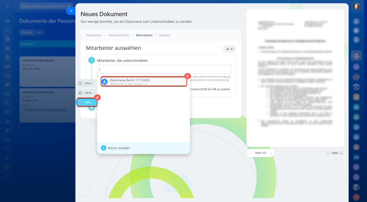8–9. Wählen Sie die Mitarbeiter aus, die das Dokument unterzeichnen sollen – klicken Sie auf Mitarbeitergruppen und wählen Sie die gewünschte aus.