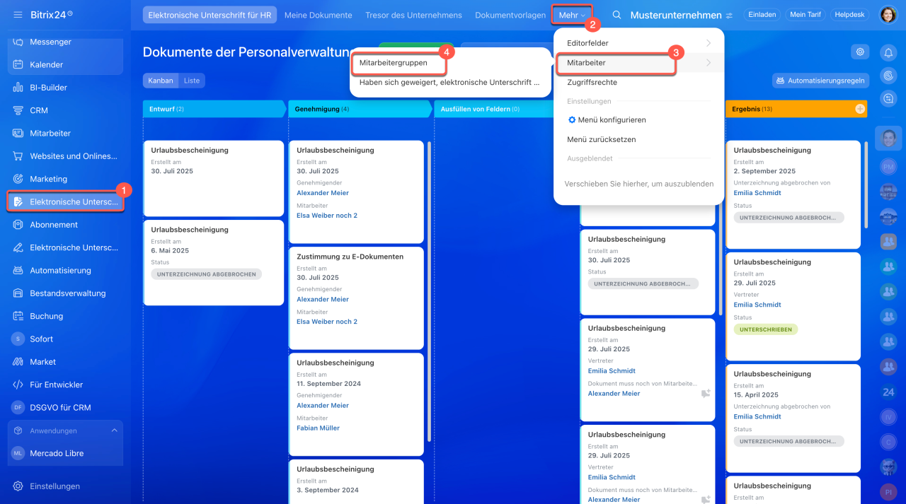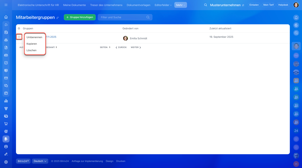 - Mit der elektronischen Unterschrift für HR in Bitrix24 können Sie Mitarbeiter in Gruppen zusammenfassen – zum Beispiel nach Abteilungen, Projekten oder anderen Kriterien. Das ist besonders praktisch, wenn Sie ein Dokument mehreren Personen gleichzeitig zur Unterschrift schicken müssen.