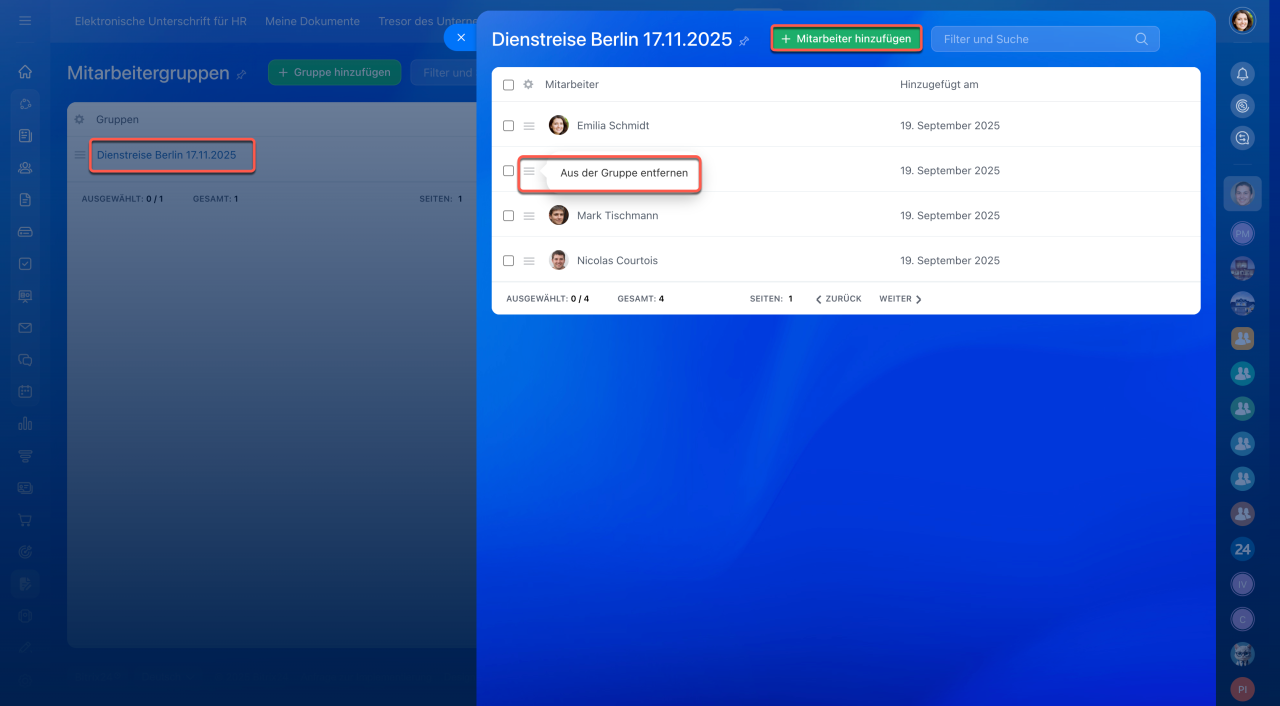 Teilnehmer bearbeiten: Fügen Sie Mitarbeiter hinzu oder entfernen Sie sie. Öffnen Sie dazu die Gruppe und nehmen Sie die gewünschten Änderungen vor.
