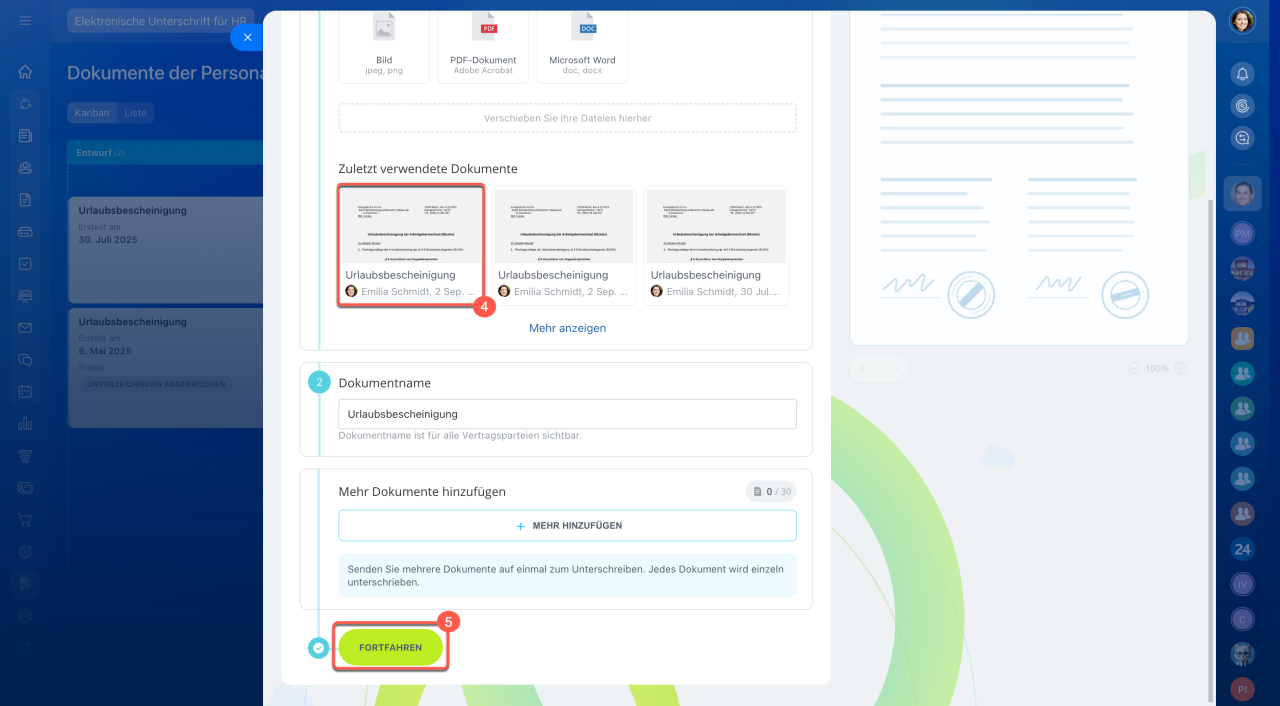 4-5. Wählen Sie ein Dokument aus den zuletzt hochgeladenen aus oder fügen Sie ein neues hinzu. Klicken Sie auf Fortfahren.