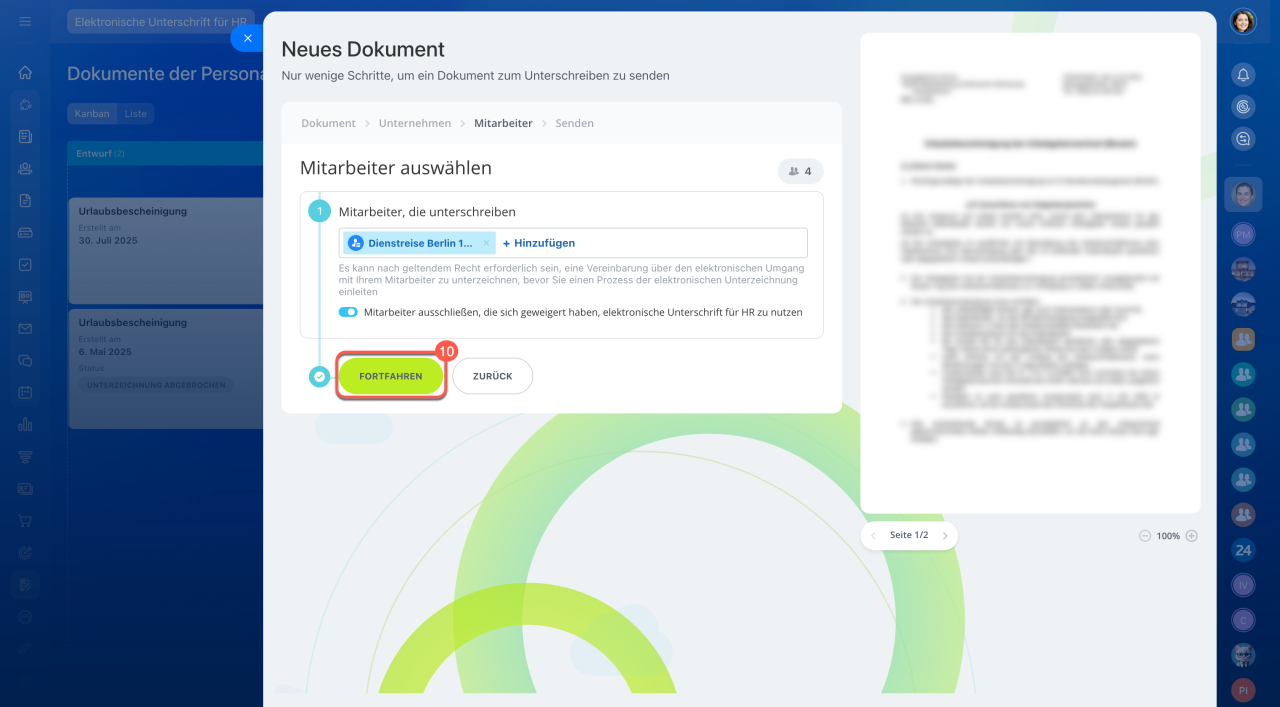 10. Klicken Sie auf Fortfahren. Wenn die Gruppe Mitarbeiter hat, die sich geweigert haben, elektronische Personalunterlagen zu unterzeichnen, erhalten sie das Dokument nicht.