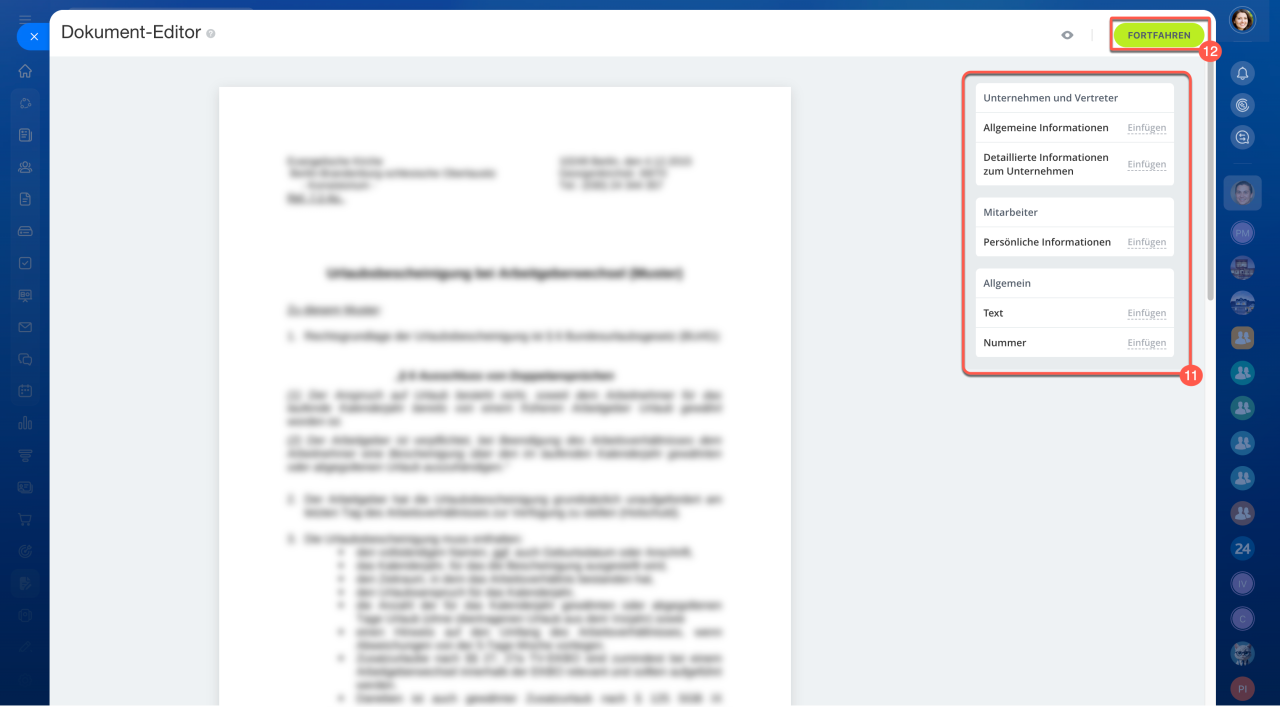11–12. Bearbeiten Sie das Dokument, falls erforderlich. Verwenden Sie dazu die Editorblöcke auf der rechten Seite. Klicken Sie auf Fortfahren.