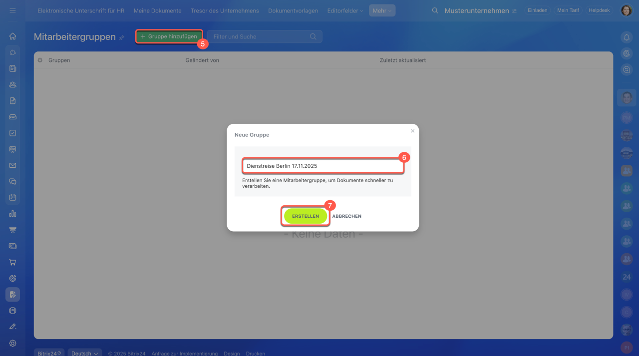 6–7. Geben Sie einen Gruppennamen ein, z. B. „Dienstreise Berlin 17.11.2025“. Klicken Sie auf Erstellen.