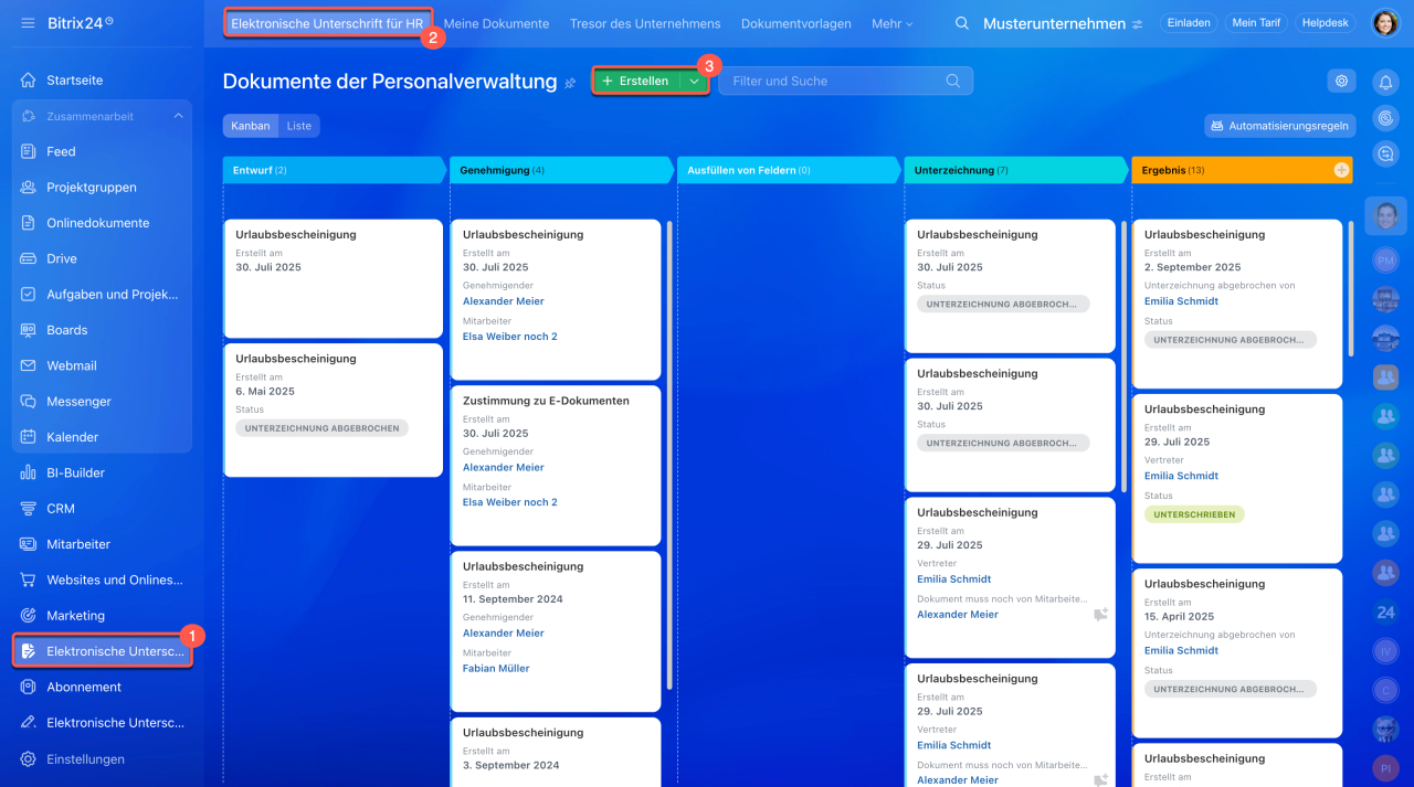 Mit der elektronischen Unterschrift für HR in Bitrix24 können Sie Mitarbeiter in Gruppen zusammenfassen – zum Beispiel nach Abteilungen, Projekten oder anderen Kriterien. Das ist besonders praktisch, wenn Sie ein Dokument mehreren Personen gleichzeitig zur Unterschrift schicken müssen. So sparen Sie Zeit und vermeiden manuellen Aufwand.