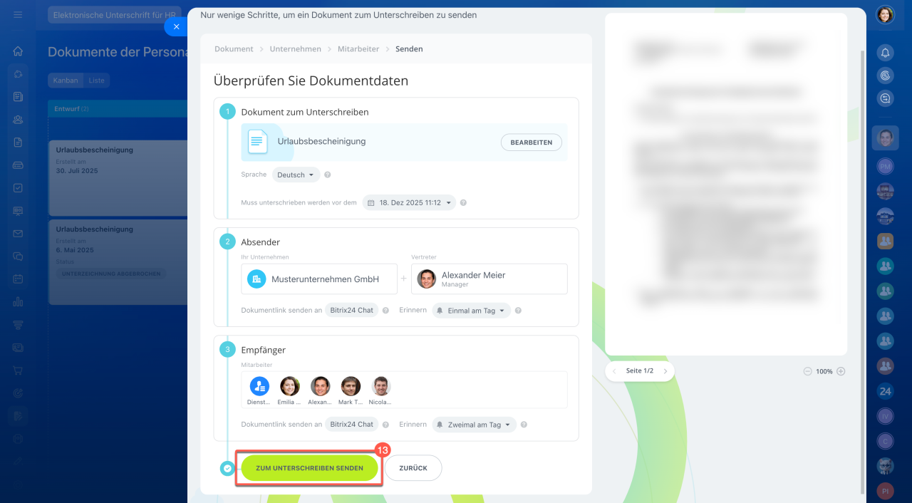 13. Überprüfen Sie die Daten und klicken Sie auf Zur Unterschreiben senden.