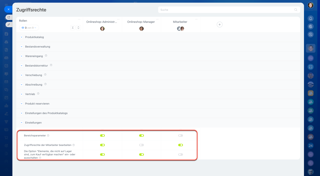 Öffnen Sie den Bereich CRM > Einstellungen > Zugriffsrechte für Bestandsverwaltung. Damit Mitarbeiter Katalogeinstellungen anpassen, Zugriffsrechte verwalten oder den Verkauf nicht vorrätiger Produkte freigeben können, sind folgende Rechte notwendig: