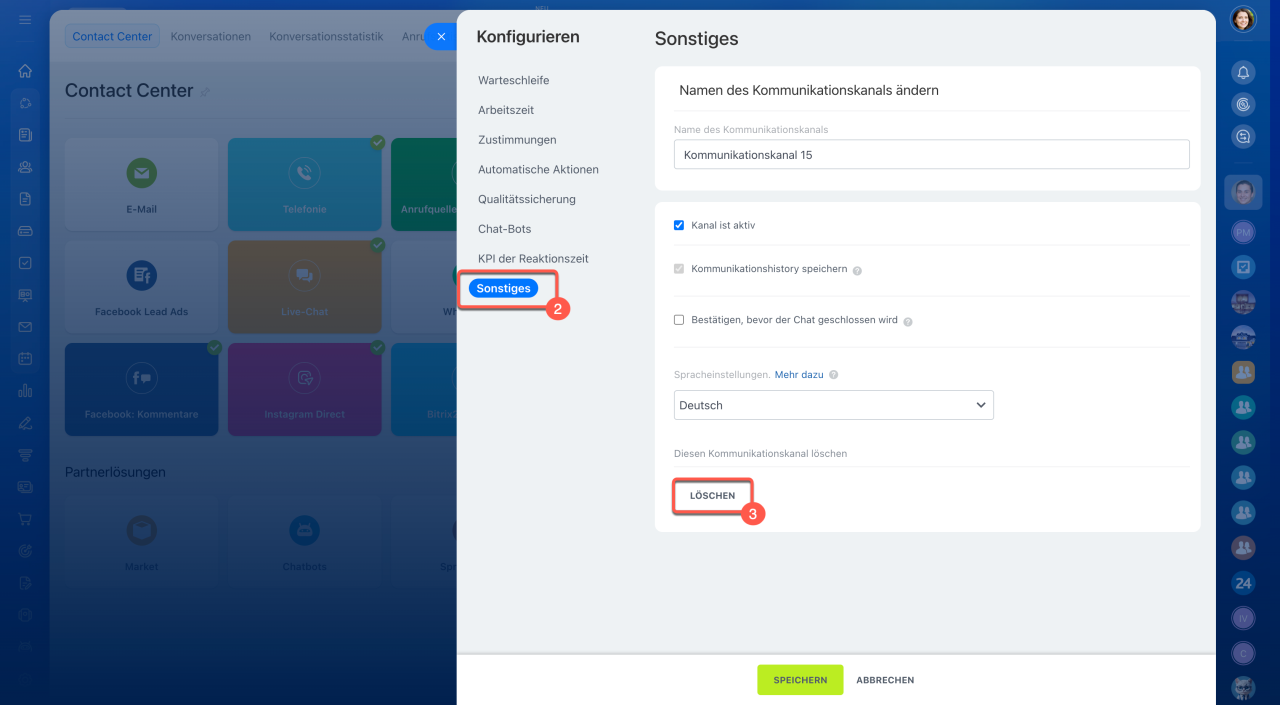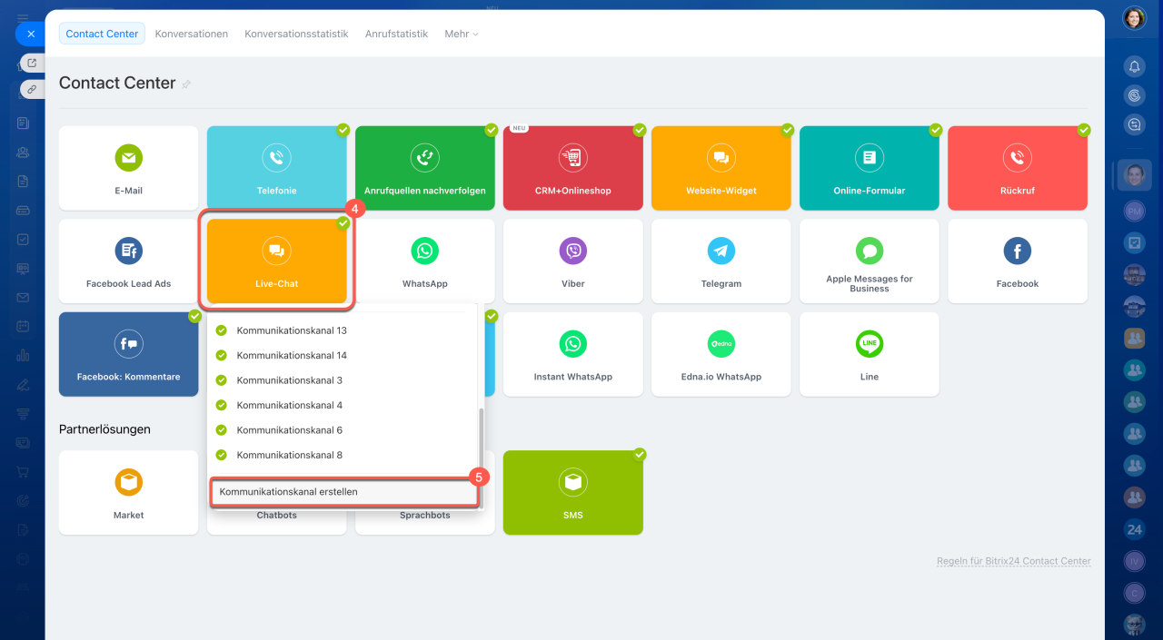 1–2. Öffnen Sie im Contact Center einen beliebigen Kanal und wählen Sie einen Kommunikationskanal aus.
