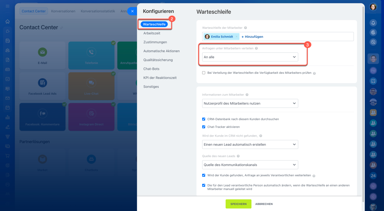 Bei den Verteilungsmethoden „Gleichmäßig“ und „Der Reihenfolge nach“ können Sie die maximale Anzahl der Dialoge pro Mitarbeiter manuell festlegen]. Gehen Sie dazu wie folgt vor: