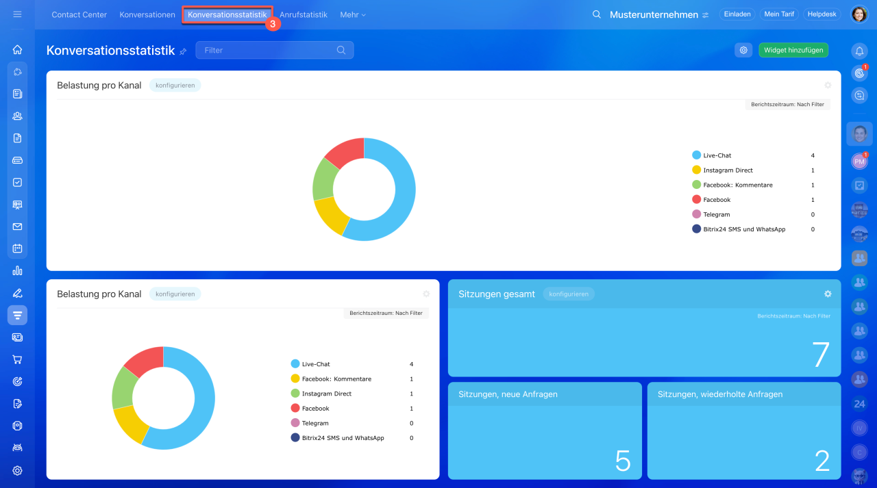Öffnen Sie den Bereich CRM > Kunden > Contact Center > Konversationsstatistik.