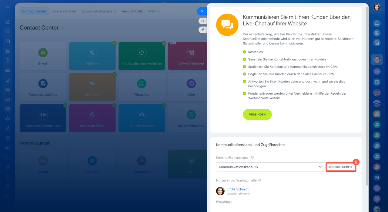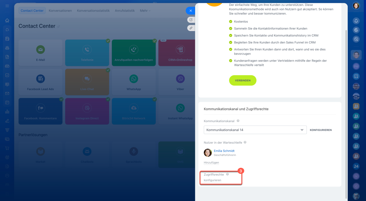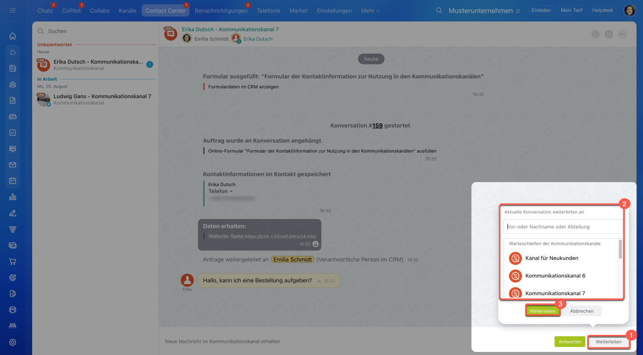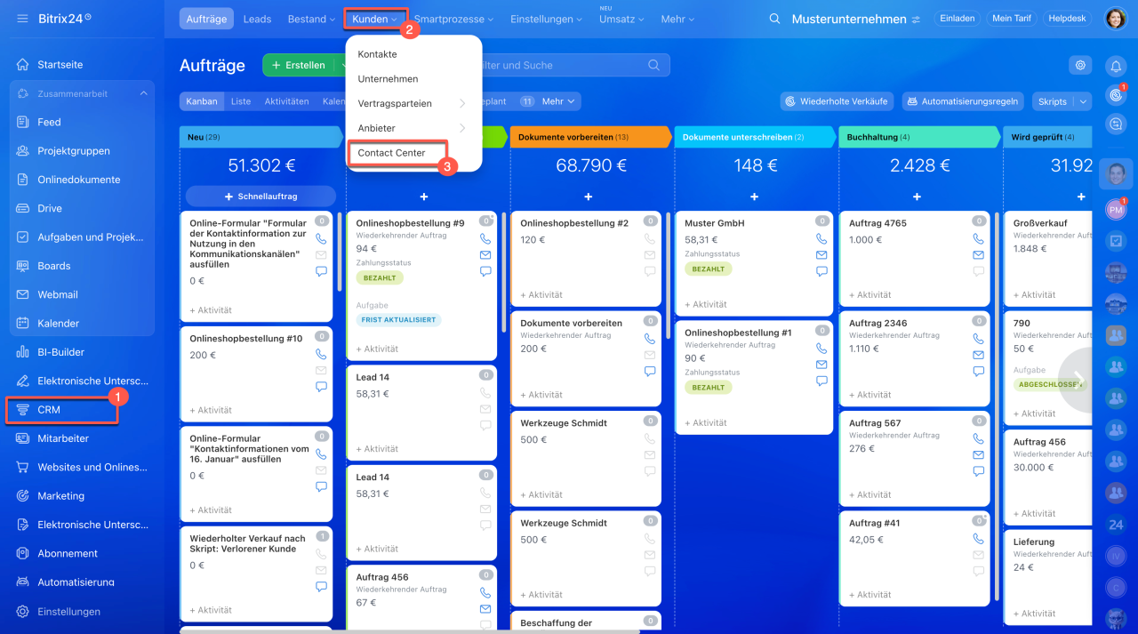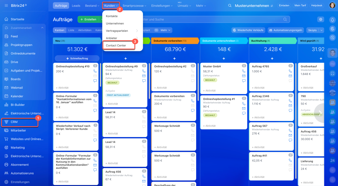 1–3. Öffnen Sie den Bereich CRM > Kunden > Contact Center.