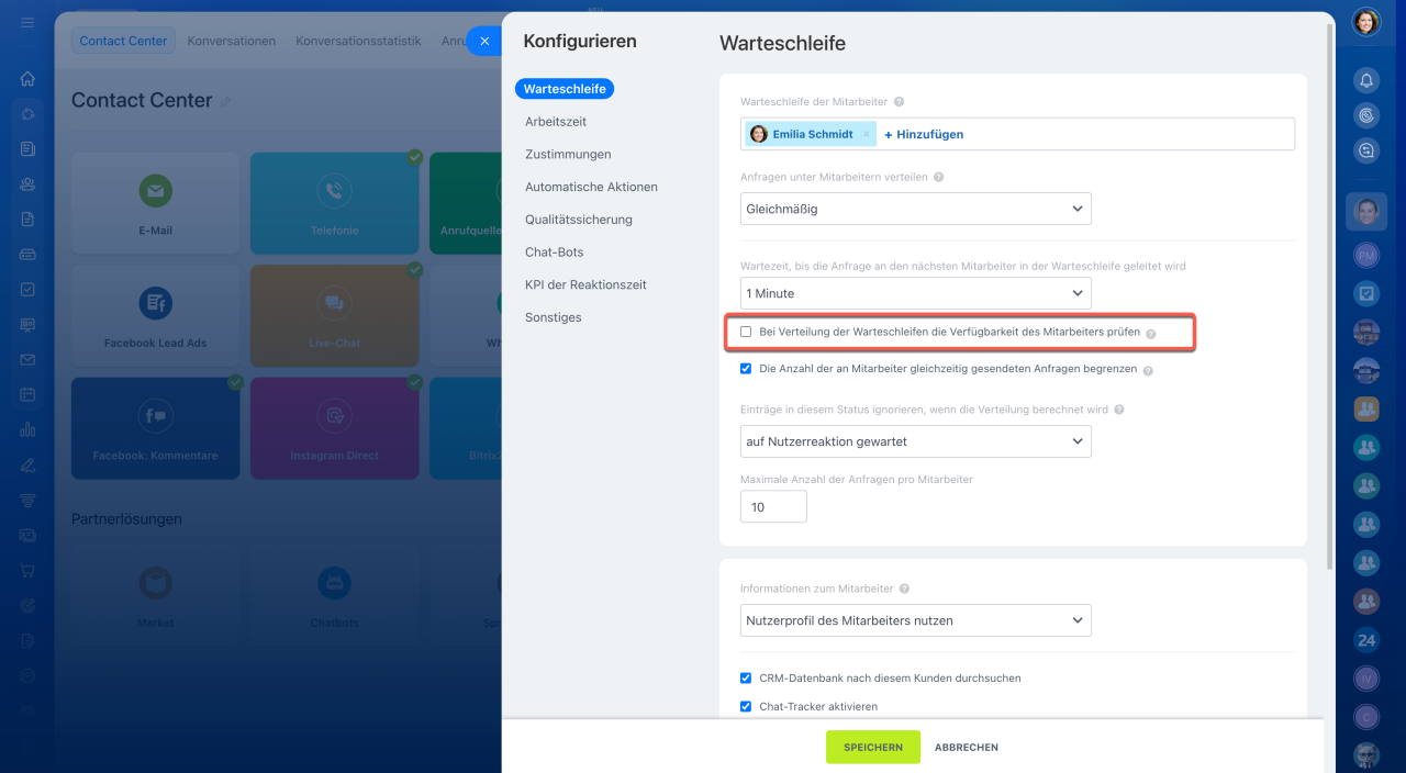 Aktivieren Sie in den Einstellungen des Kommunikationskanals die Option „Bei Verteilung der Warteschleifen die Verfügbarkeit des Mitarbeiters prüfen“. Dadurch werden neue Dialoge nicht an Mitarbeiter weitergeleitet, die gerade offline, in der Pause oder im Urlaub sind.