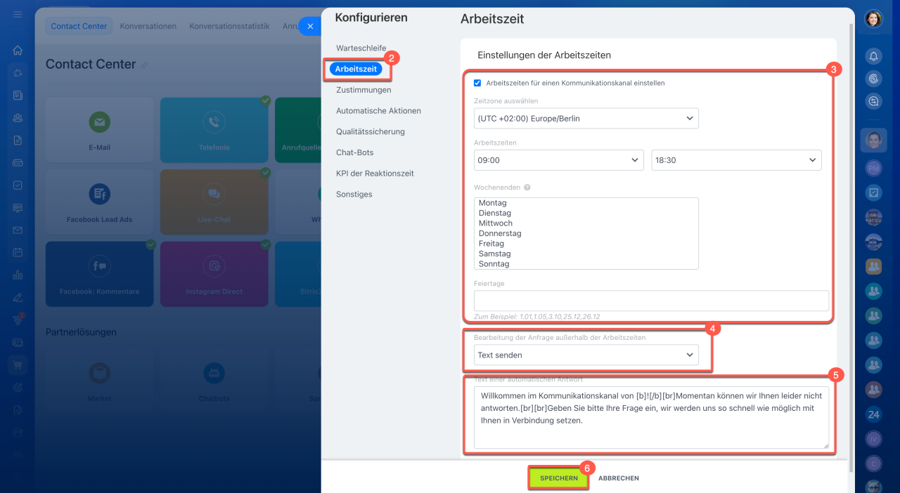 3. Legen Sie die Arbeitszeiten des Kommunikationskanals fest.