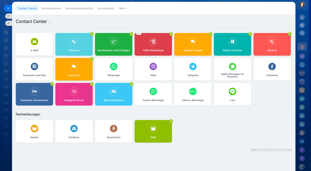 Zusätzlich können Kommunikationskanäle über Anwendungen aus dem Bitrix24 Marketplace hinzugefügt werden.