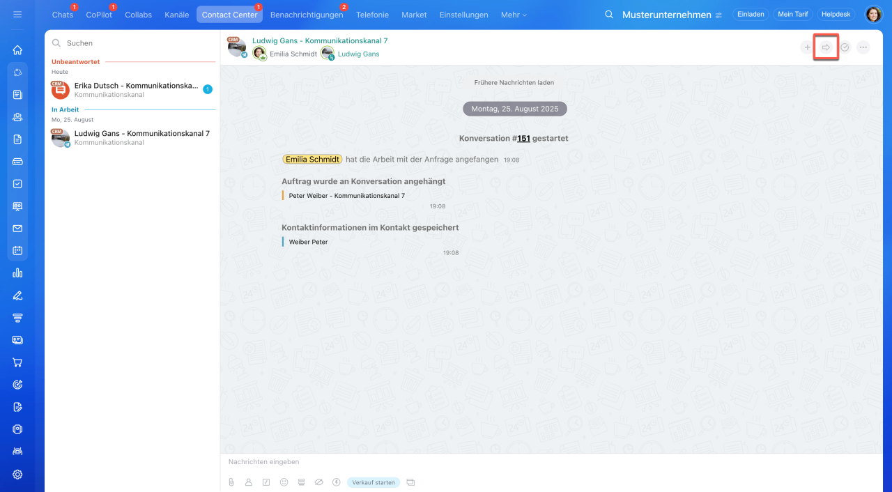 Alle Dialoge werden im Bereich Contact Center > Konversationen dauerhaft gespeichert und können dort jederzeit eingesehen werden.