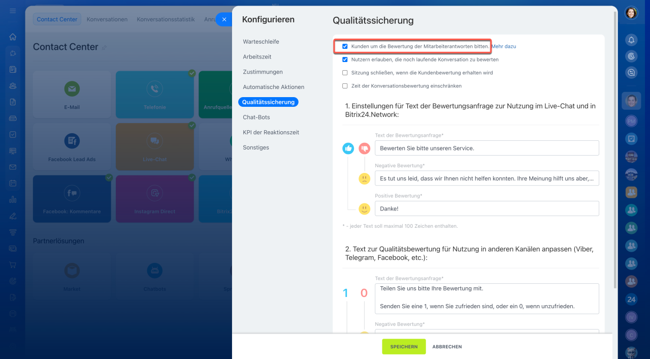 Um Kunden die Möglichkeit zu geben, die Servicequalität zu bewerten, öffnen Sie in den Einstellungen des Kommunikationskanals den Bereich Qualitätssicherung und aktivieren Sie die Option „Kunden um Bewertung der Mitarbeiterantworten bitten“.