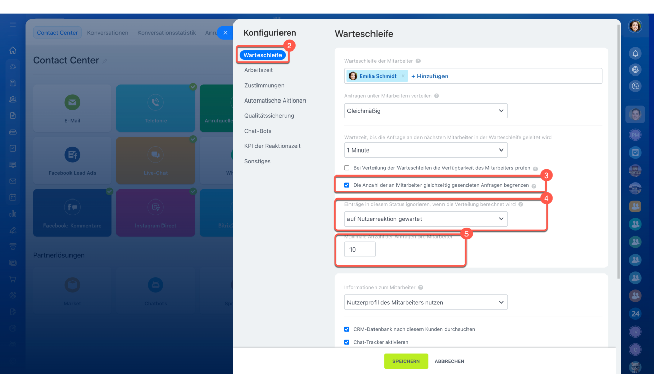 5. Geben Sie die maximale Anzahl gleichzeitiger Anfragen pro Mitarbeiter ein. Sobald ein Mitarbeiter dieses Limit erreicht, erhält er keine neuen Anfragen mehr zugewiesen.