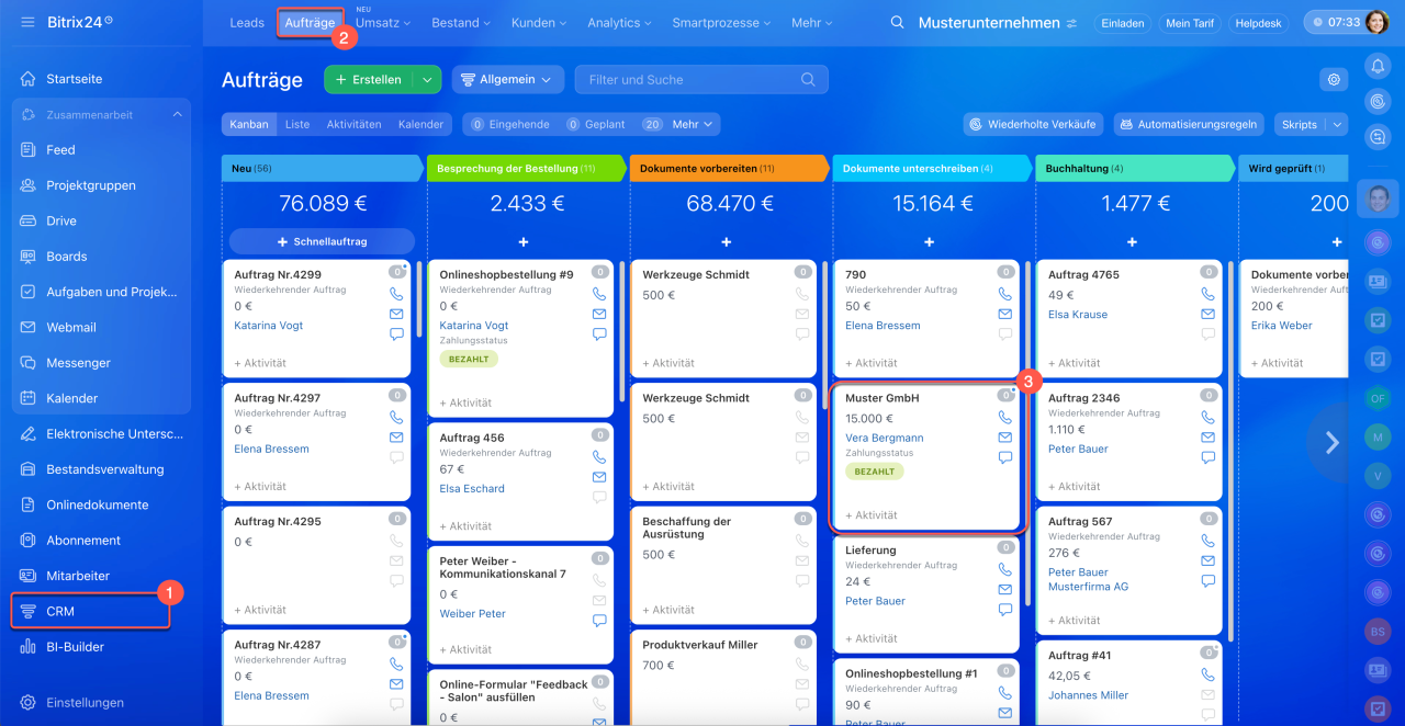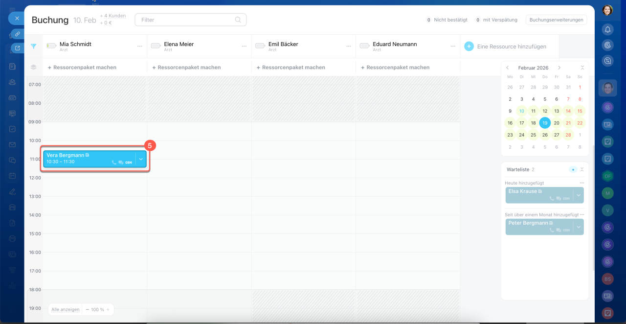 Im Formular des CRM-Elements. Öffnen Sie den Bereich CRM und wählen Sie das gewünschte Element, z. B. einen Kontakt oder einen Auftrag. Klicken Sie in der Timeline auf Buchung und wählen Sie eine Zeit für die gewünschte Ressource aus.