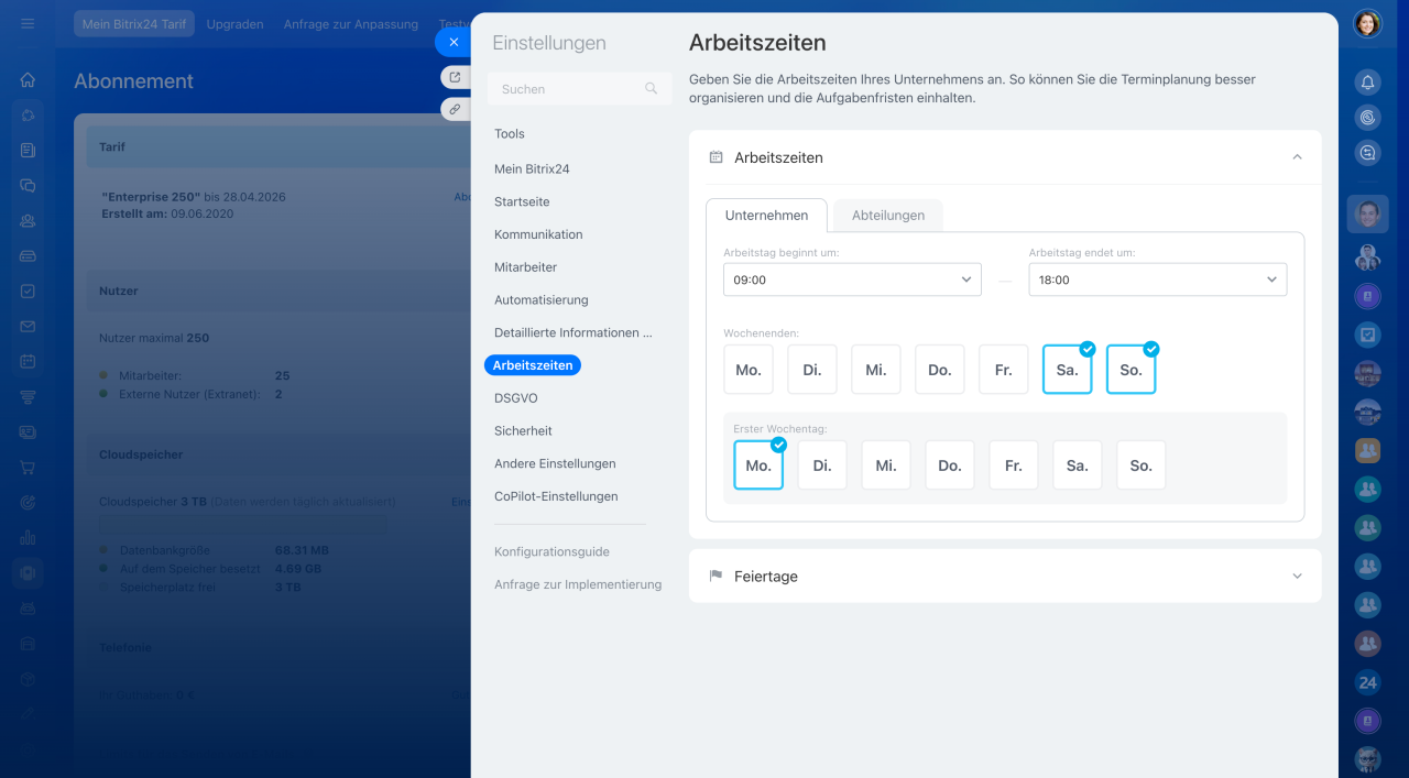- Sie berücksichtigt automatisch die in den Bitrix24 Einstellungen definierten Arbeitstage.