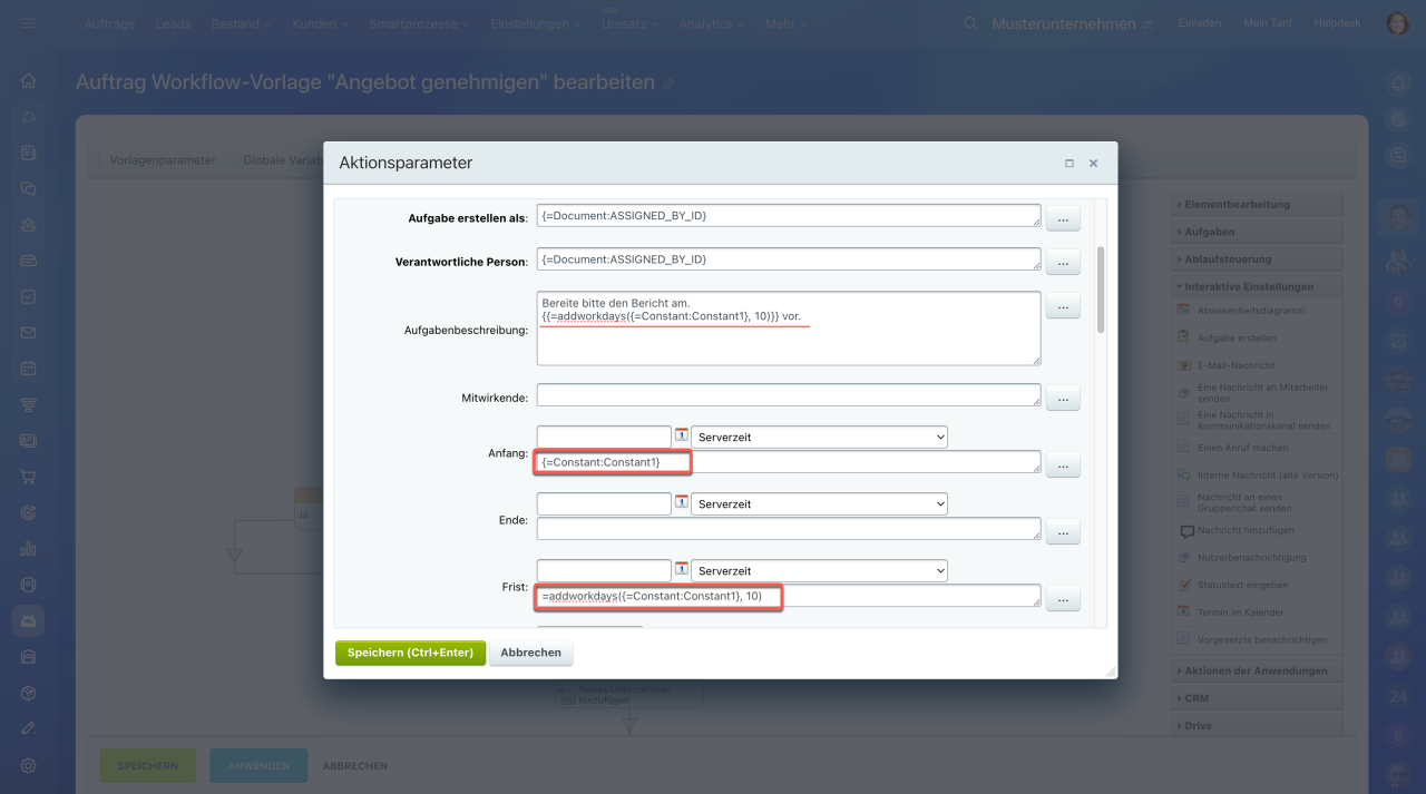 - =addworkdays({=Document\:DATE_CREATE}, 1) — Als Ergebnis erhalten wir ein Datum, das dem Erstellungsdatum des Elements plus 1 Arbeitstag entspricht.