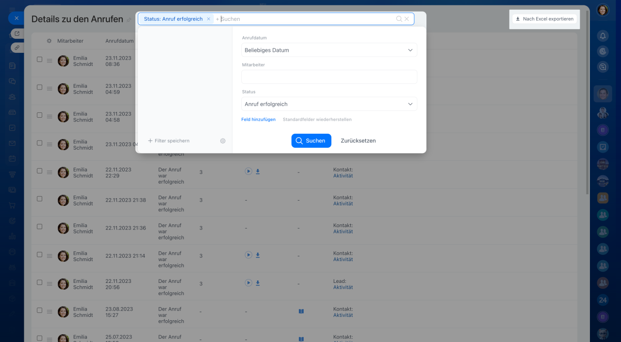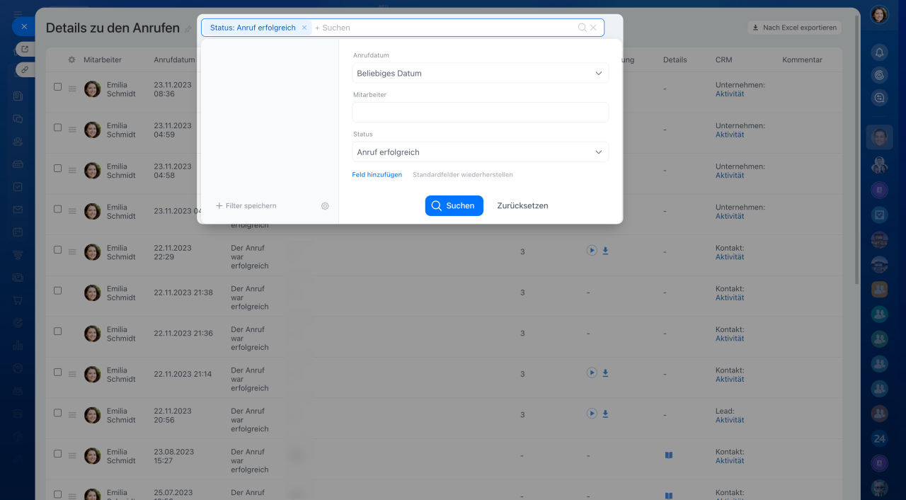 - Die Anrufdetails enthalten die Information zu jedem Anruf: Telefonnummer des Kunden, Anrufaufzeichnung, Anrufdatum, Dauer usw. Diese Daten können gefiltert und für die Bewertung der Arbeitsleistung verwendet werden.