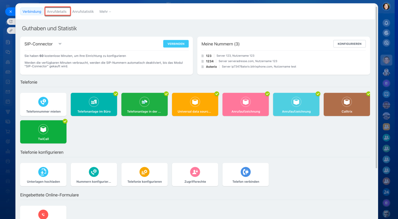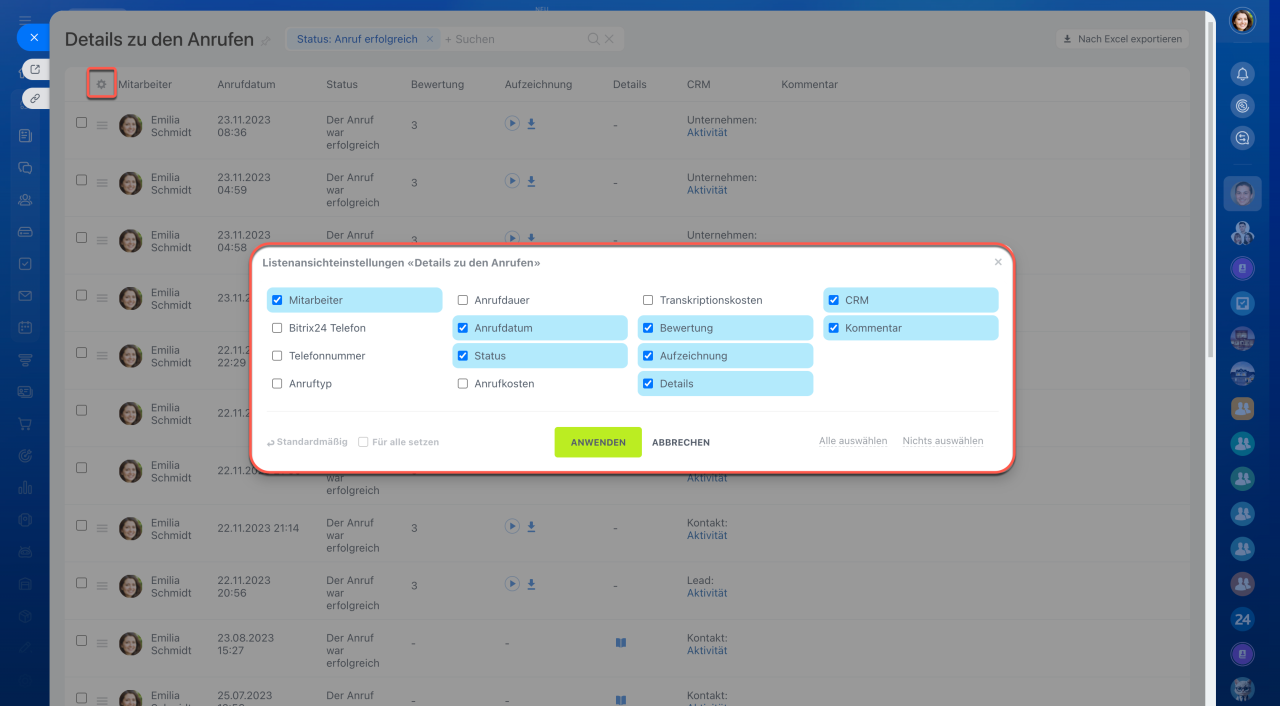 In Bitrix24 können Sie alle ein- und ausgehenden Anrufe detailliert erfassen, analysieren und verwalten. Diese Funktion hilft Ihnen nicht nur, die Kommunikation mit Kunden nachzuvollziehen, sondern auch die Arbeitszeit Ihrer Mitarbeiter zu überwachen.