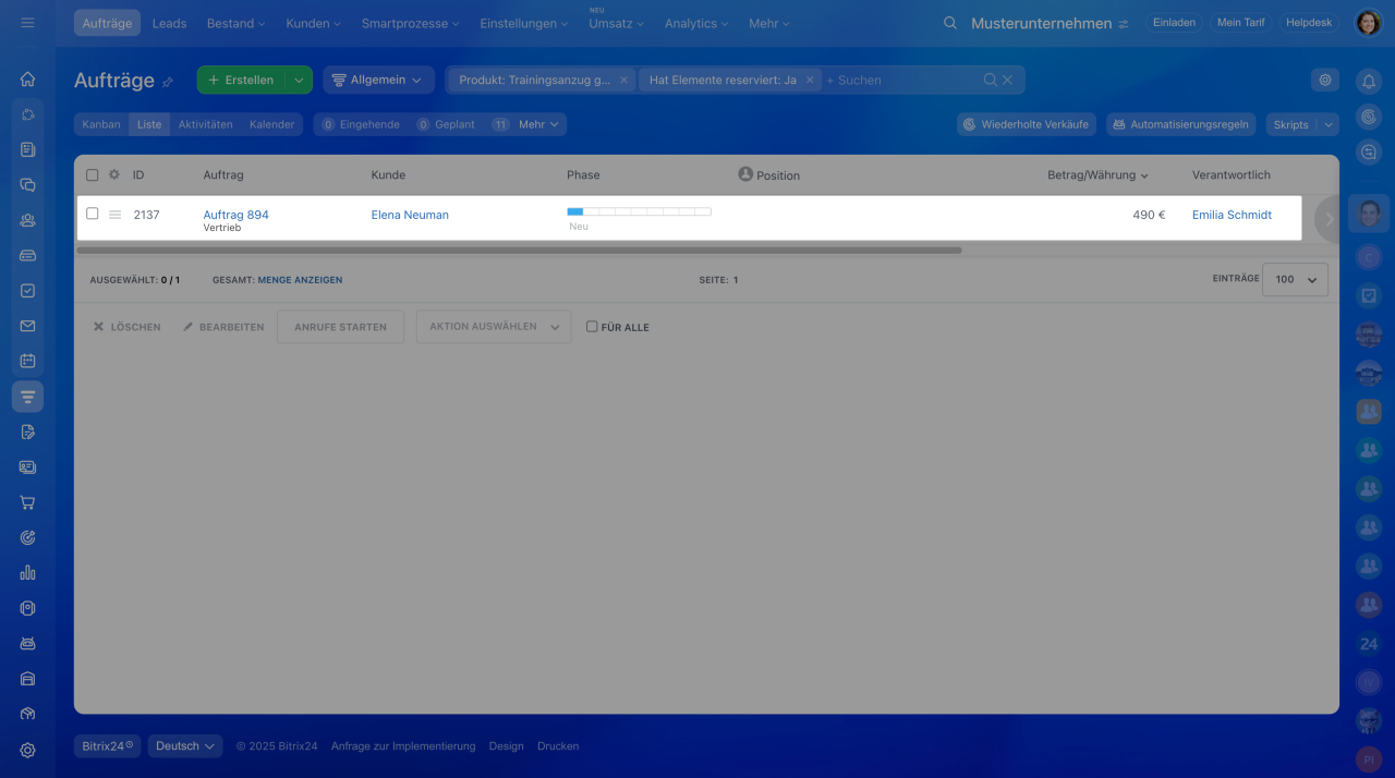Im Unternehmen ist es wichtig, den Überblick über reservierte Produkte zu behalten. Bitrix24 bietet Ihnen die Möglichkeit, schnell und einfach zu prüfen, welche Produkte in welchen Aufträgen reserviert sind. Dies hilft, Fehlreservierungen zu vermeiden und die Verfügbarkeit von Produkten effizient zu verwalten.