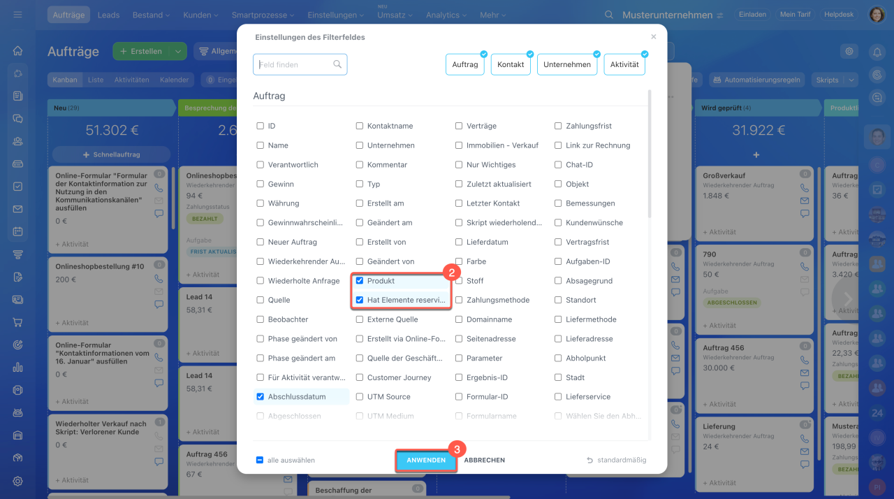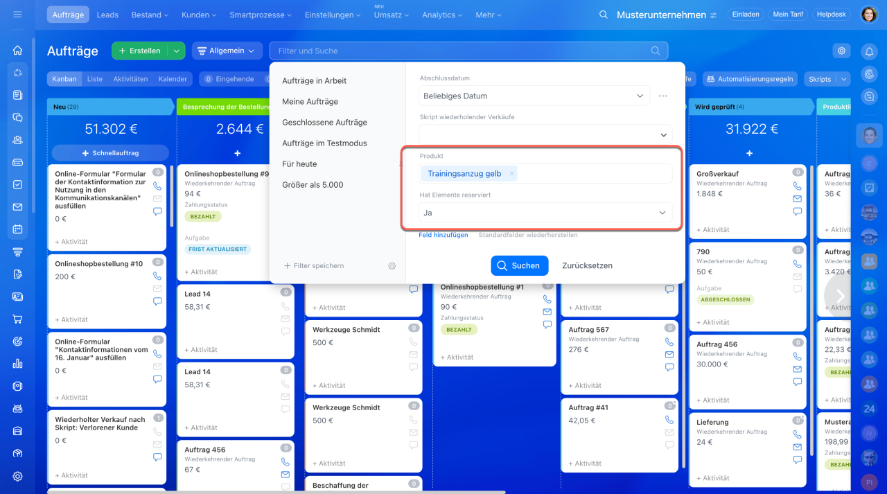 Reservierte Produkte in Aufträgen über den Filter anzeigen