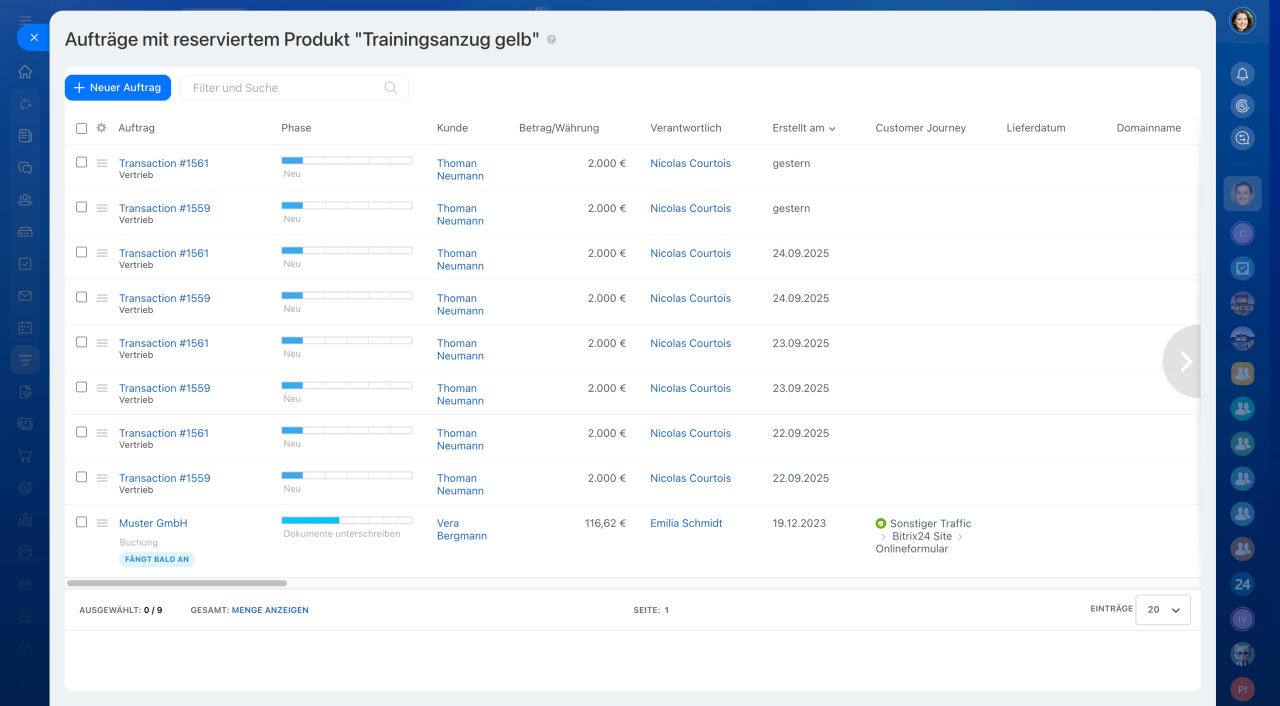 - Bitrix24 bietet Ihnen die Möglichkeit, schnell und einfach zu prüfen, welche Produkte in welchen Aufträgen reserviert sind. Dies hilft, Fehlreservierungen zu vermeiden und die Verfügbarkeit von Produkten effizient zu verwalten.