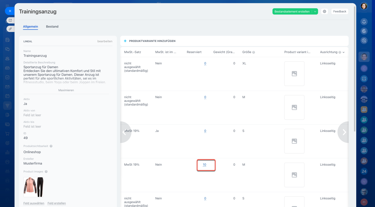 - Im Feld Reserviert wird die Menge der reservierten Produkte angezeigt. Klicken Sie auf die Zahl in der gewünschten Produktvariante.
