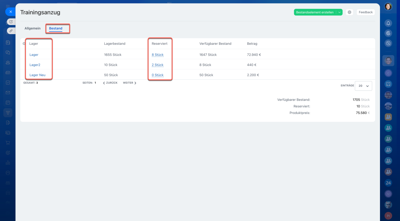 Im Tab Bestand des Produktformulars finden Sie Informationen darüber, in welchen Lagern das Produkt reserviert ist. Durch Klicken auf die Menge der reservierten Produkte öffnet sich eine Liste der entsprechenden Aufträge.