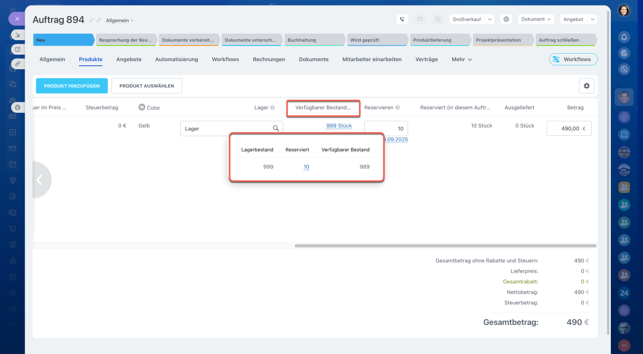- Um die Produktverfügbarkeit im Auftrag zu prüfen, öffnen Sie im Auftrag den Tab Produkte und klicken Sie auf das Feld Verfügbarer Bestand.