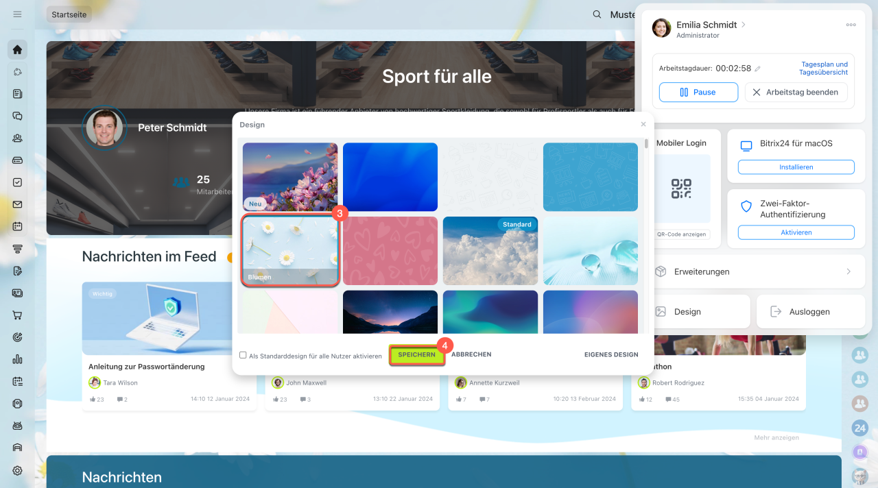 3. Wählen Sie ein vordefiniertes Thema aus oder erstellen Sie ein eigenes Design. Dieses wird allen Mitarbeitern in Ihrem Bitrix24 angezeigt.