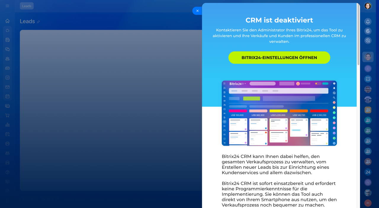 Wenn Sie zum Beispiel CRM deaktivieren, verschwindet es aus dem Hauptmenü. Beim Versuch, das Tool über einen direkten Link aufzurufen, erscheint eine Benachrichtigung, dass Ihr CRM deaktiviert ist.
