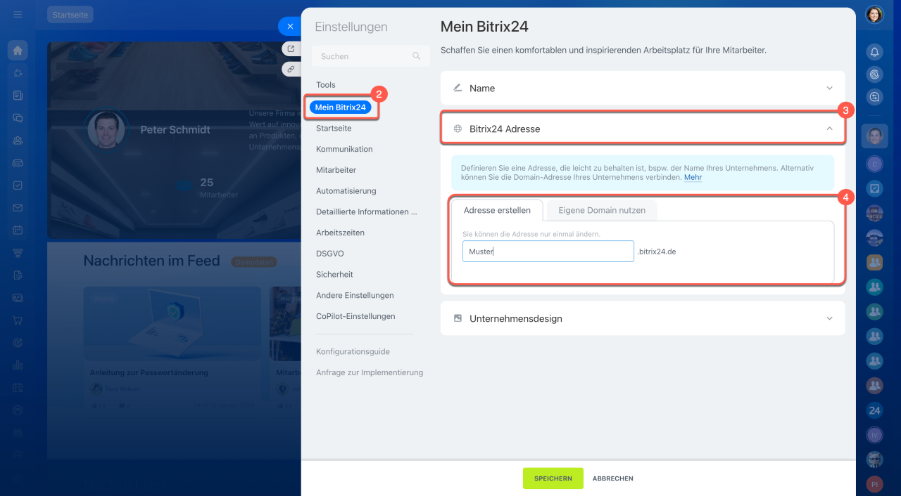 1–3. Öffnen Sie den Bereich Einstellungen > Mein Bitrix24 > Adresse Ihres Bitrix24.