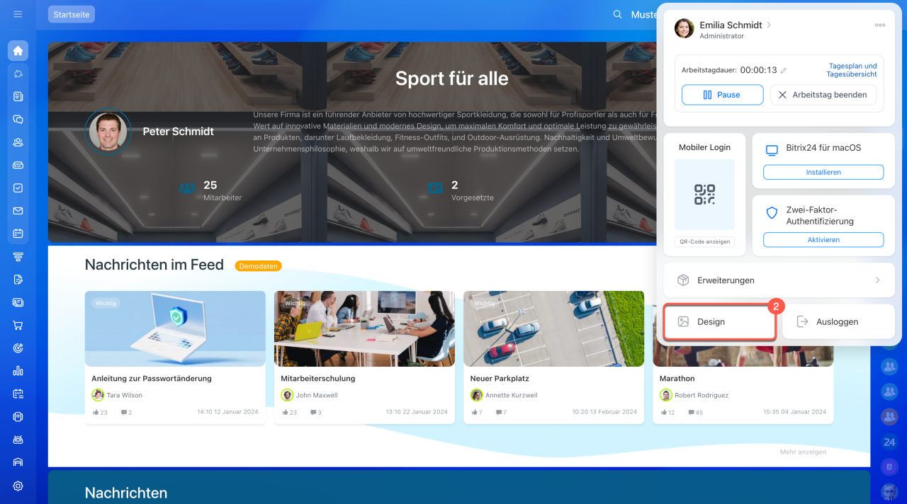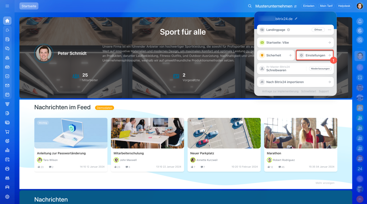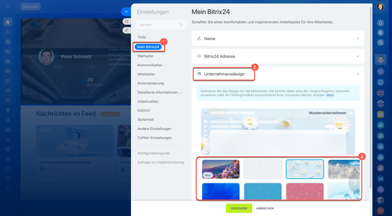 1–2. Öffnen Sie den Bereich Einstellungen > Mein Bitrix24 > Unternehmensdesign.