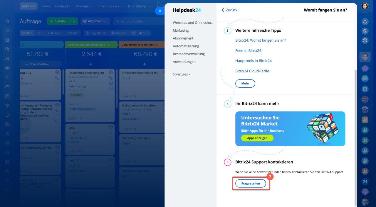 Bei Fragen zur Arbeit mit Bitrix24 können Sie sich an den Support wenden und eine Beratung im Chat erhalten. Hier finden Sie Antworten auf häufig gestellte Fragen zum Support.