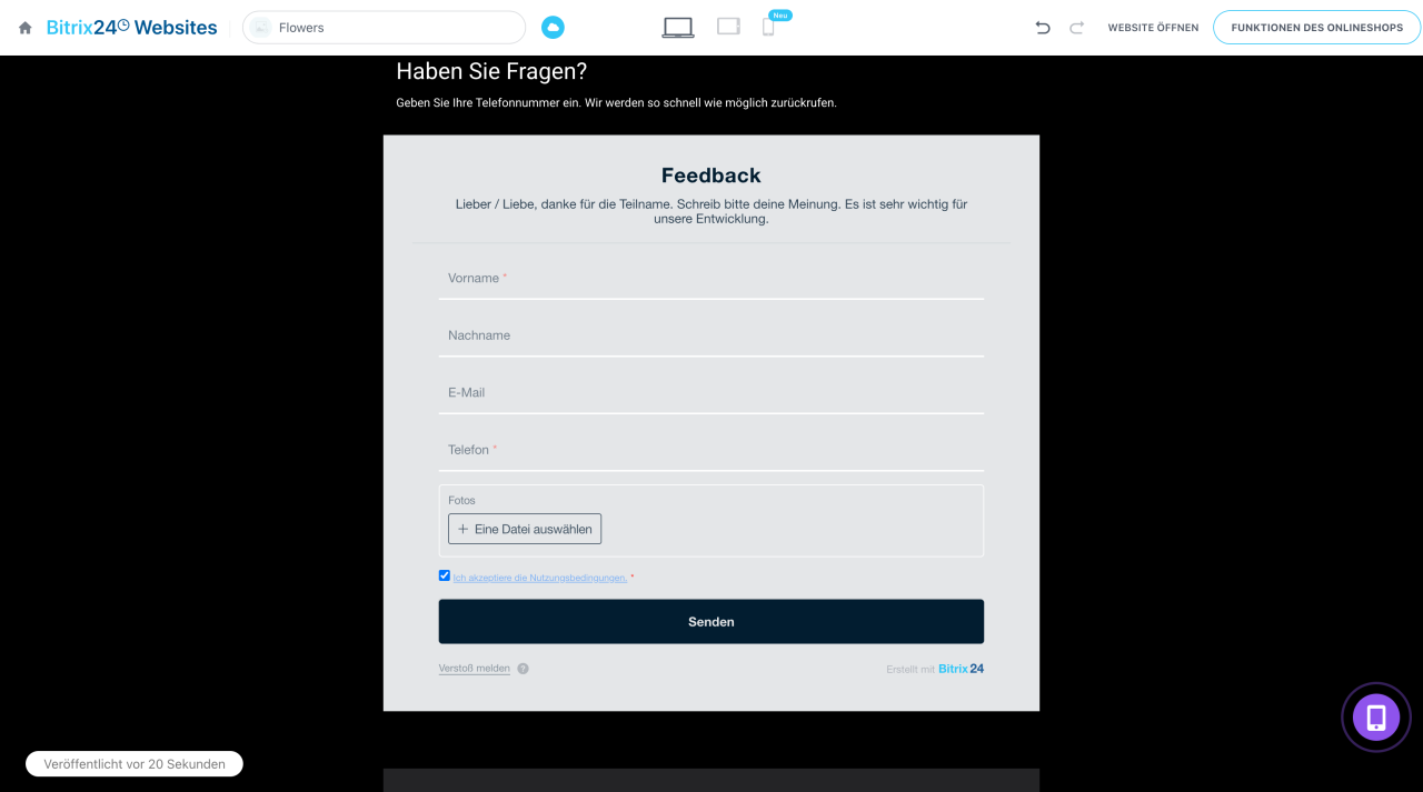 Bitrix24 erstellt eine neue Seite in der Vertriebsstelle und fügt automatisch das ausgewählte Online-Formular hinzu. Sie können das Design der Seite bearbeiten und Ihre Kontaktdaten ergänzen.