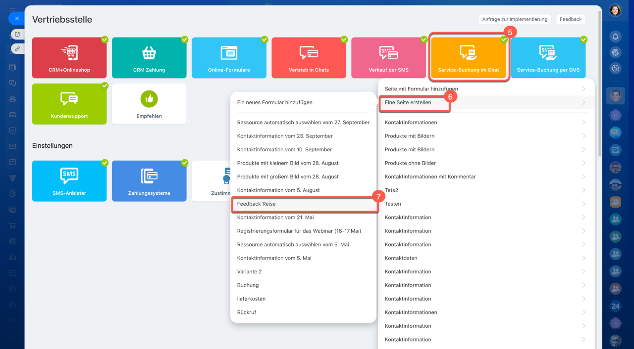 2. Klicken Sie auf Servicebuchung im Chat > Seite erstellen und wählen Sie das gewünschte Online-Formular aus.