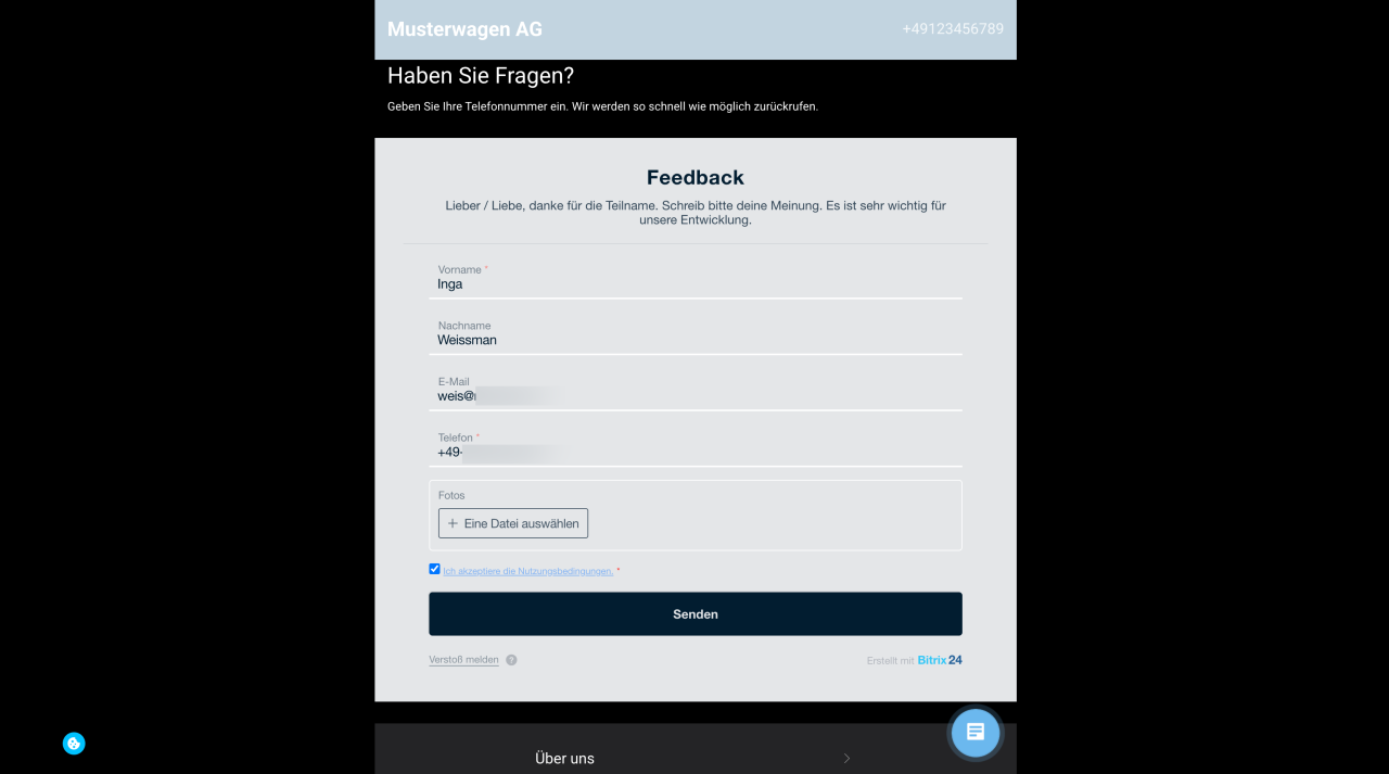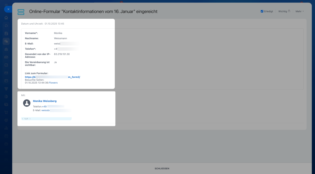 - Nach dem Ausfüllen des Formulars durch den Kunden werden alle Informationen automatisch im CRM-Element gespeichert.