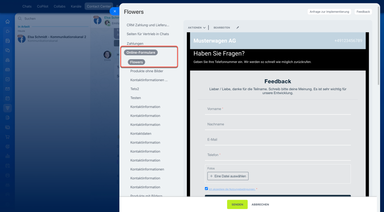 Während der Kommunikation mit Kunden können Sie Online-Formulare direkt über die Vertriebsstelle versenden. Das ist besonders nützlich, um Daten strukturiert zu erfassen oder Anfragen effizient zu bearbeiten.