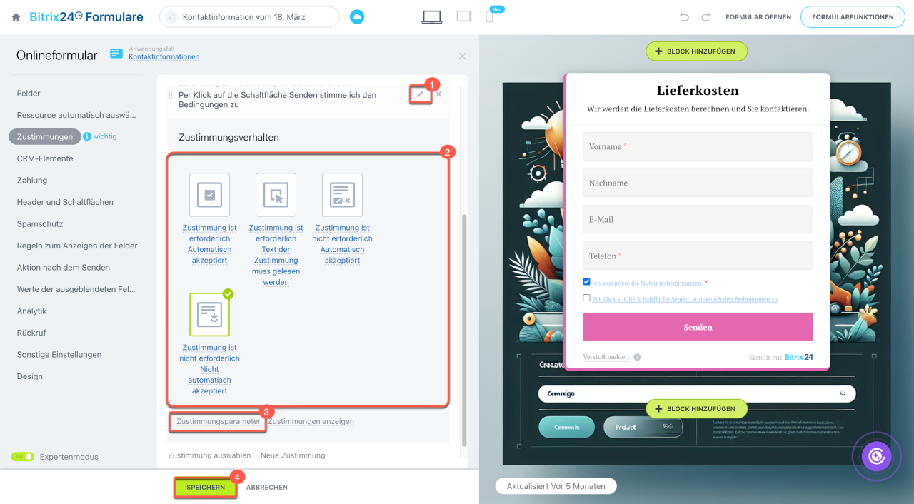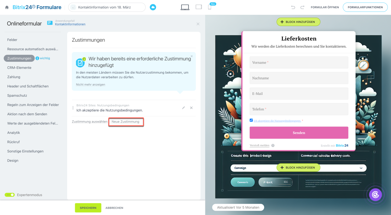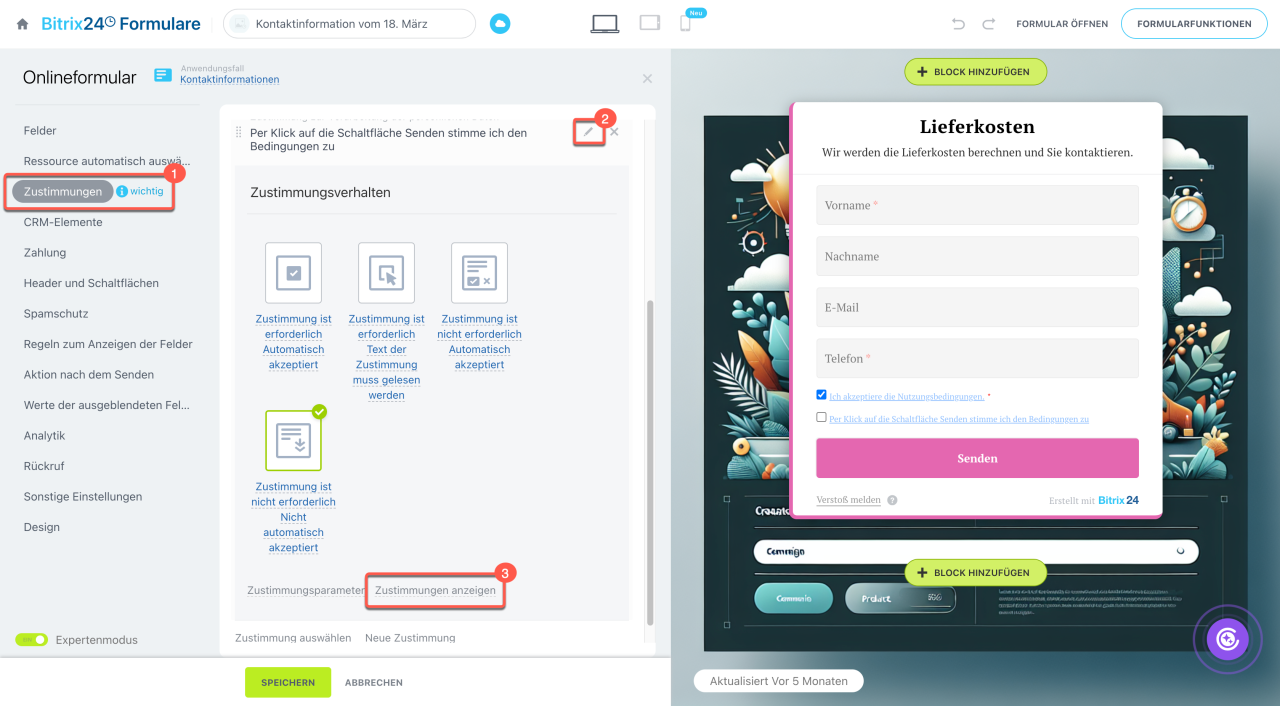 - Zustimmung ist erforderlich. Automatisch akzeptiert – Das Kontrollkästchen ist voraktiviert. Deaktiviert der Kunde es, kann das Formular nicht abgesendet werden.