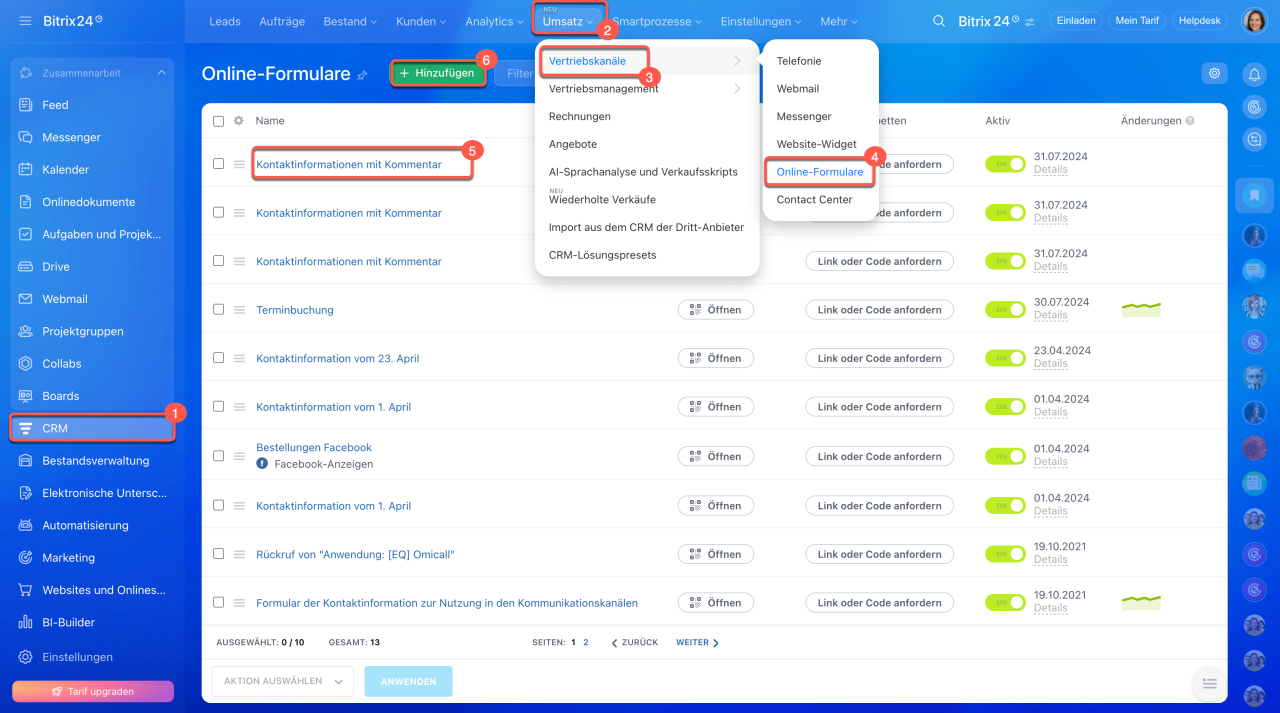 1–4. Öffnen Sie den Bereich CRM > Umsatz > Vertriebskanäle > Online-Formulare.