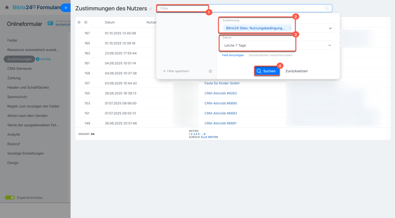 1–2. Klicken Sie auf „Filter“ und wählen Sie im Feld „Zustimmung“ die gewünschte aus.